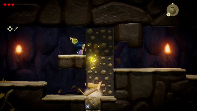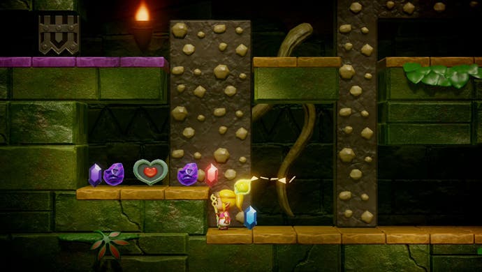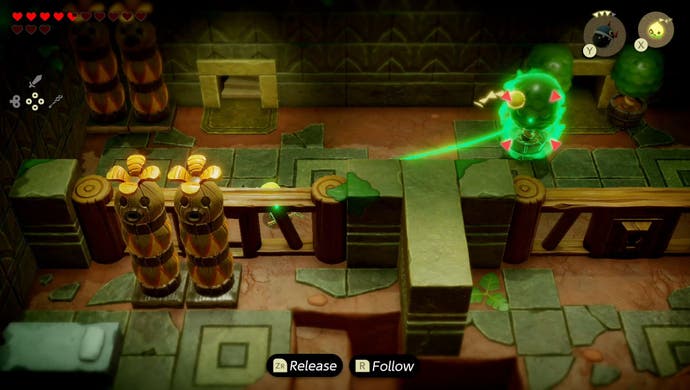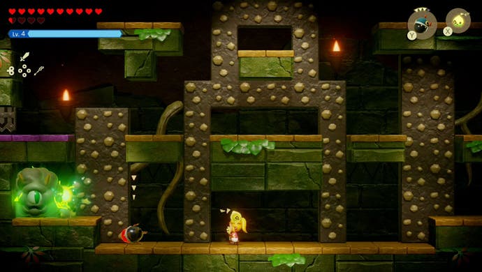 Head inside and you'll find a Heart Piece standing atop of a set of Deku pillars. To reach it you'll need to create a way up using Bind and the objects within this room. Take a look at our screenshot below for an example.