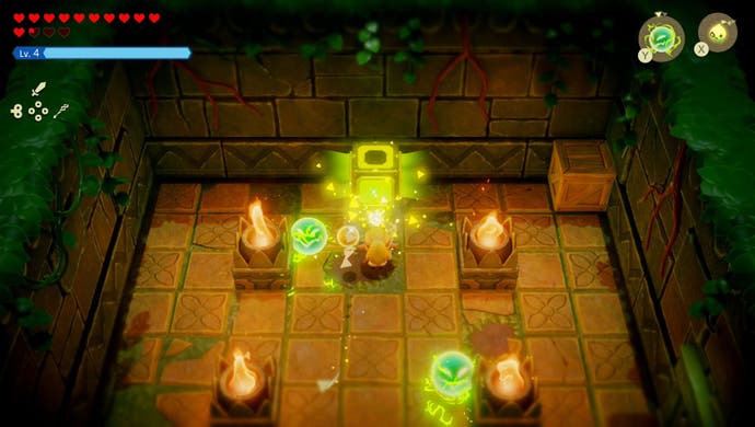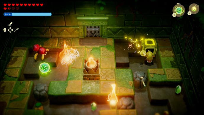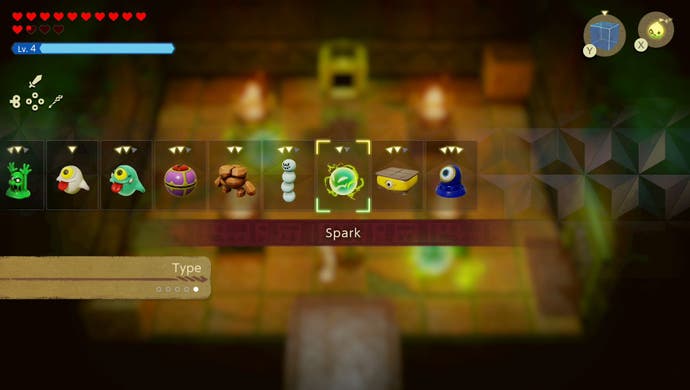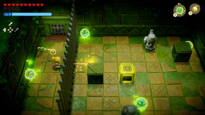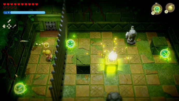 If you haven't picked up on it yet, the goal of this dungeon is to unlock the doors using the Spark Echo. This next room is a little more complicated as the box you're looking for is blocked by both a fence and stone block.