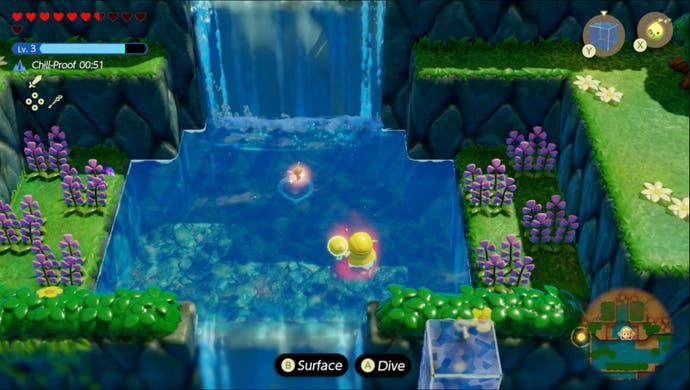 There's a Heart Piece sitting beneath the waterfall right at the very top of the Jabul Waters region. You'll need to use Echoes to reach this higher level and then dive down to grab the Heart Piece.