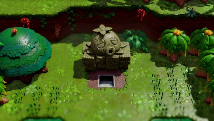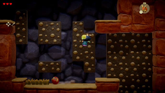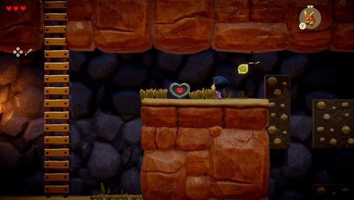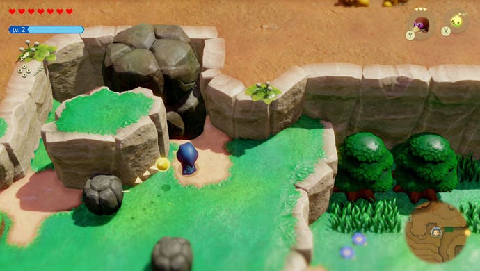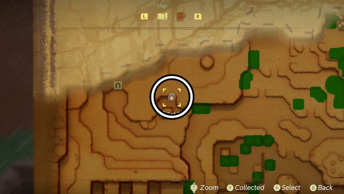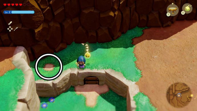 Once there you'll find a cave entrance, but don't go inside. Instead, you need to climb onto the cliff above the cave and use a Holmill Echo to dig into the patch of dirt on the left-hand side of the entrance. Now all you have to do is drop down inside to grab the Heart Piece.