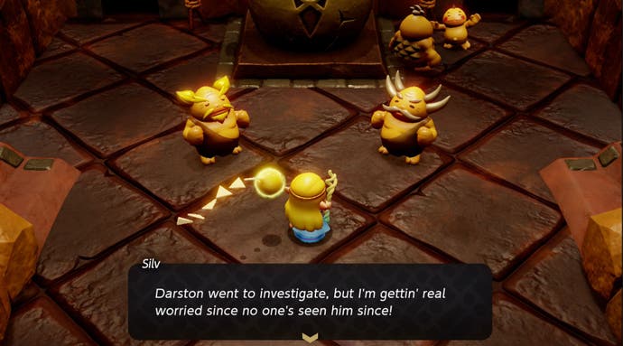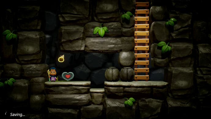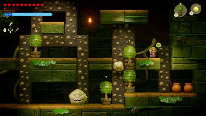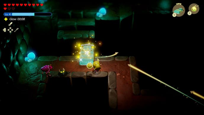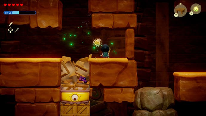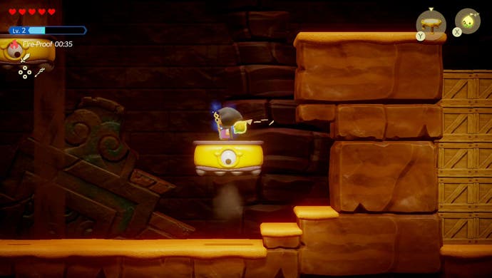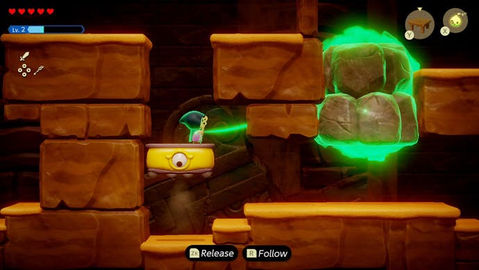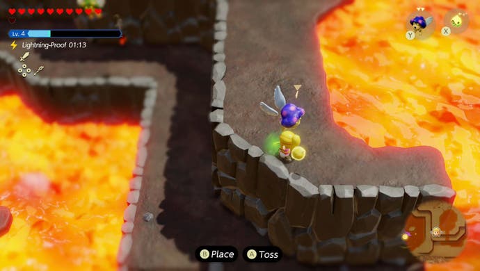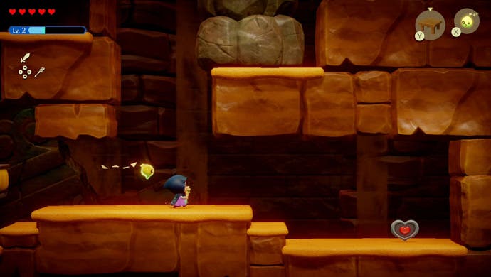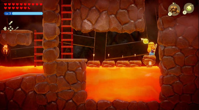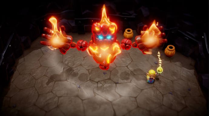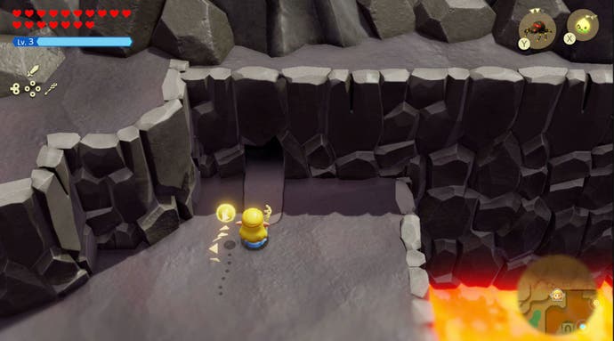 Once inside you need to talk to Darston before heading into the cave and making your way through the cavern, using Lava Rock Echoes to navigate, until you reach the final room. When you reach the final section of the side-scrolling area, you can use Tweelus Echoes to create a path across the rising lava. Make sure you heal before entering the final room as you'll now have to defeat a mini-boss.
