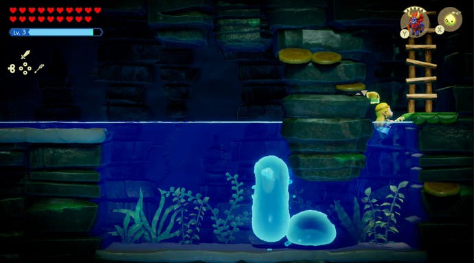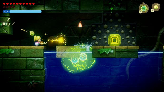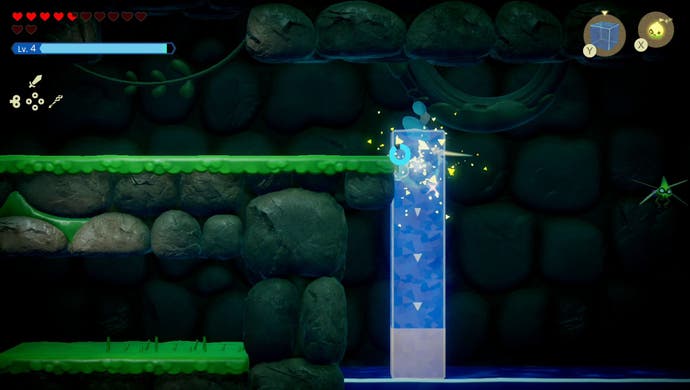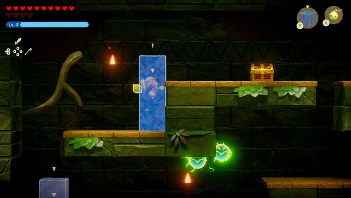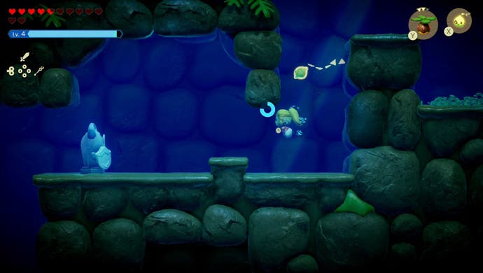 The next part of this mini-dungeon is a side scrolling segment. You can progress through this first section by using Water Block Echoes to reach the higher ledges and open the chest containing 20 Rupees.