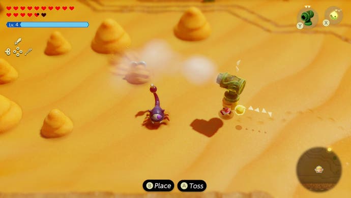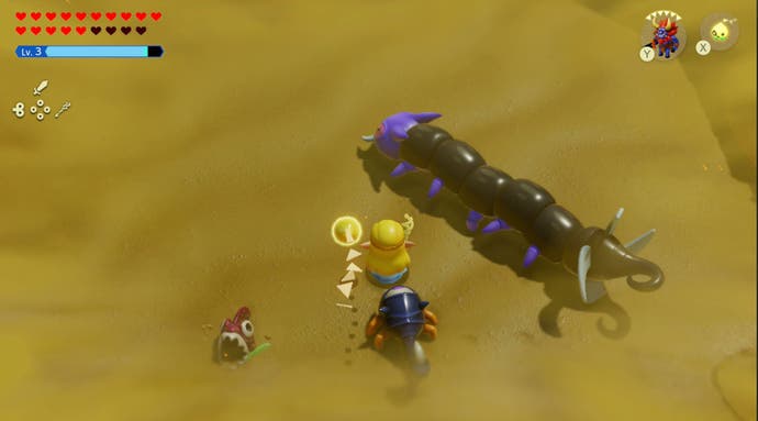 To defeat a Lanmola, you need to use Bind on its tail and pull backwards to flip the massive bug onto its back. Now all you have to do is attack it with Echoes or the Swordfighter form until the Lanmola is defeated. It's a good wear to wear the Gerudo Sandals when fighting a Lanmola as this accessory will prevent Zelda from sinking into the quicksand created by this monster.