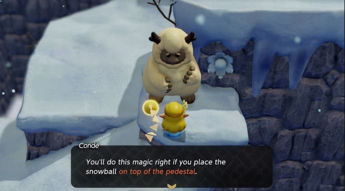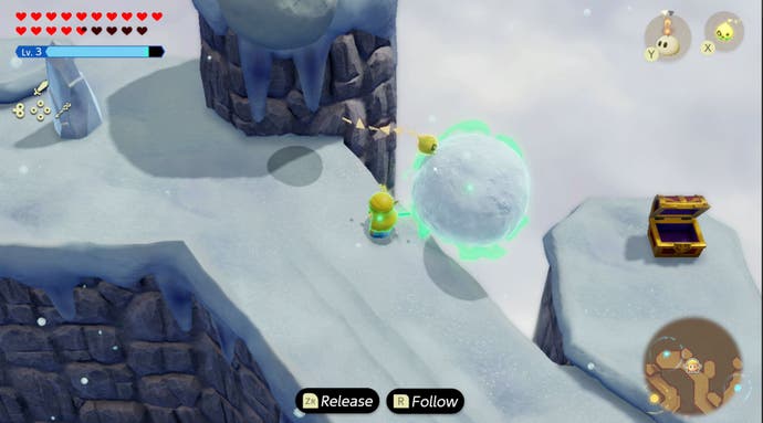 To complete this side quest, you need to carefully carry a glittering snowball using Bind to the pedestal on the north-western peak of the Hebra Mountain. If you're having trouble achieving this feat, try melting the blocks of ice you encounter with an Ignizol. It's also a good idea to bind to a snowball by standing next to the hill they roll into, then, halfway up the slope you need to climb is a platform where you'll be able to un-Bind and reposition Zelda before Binding again. Make sure you need to the left-hand side of the glittering snowball, so it's hanging over the ledge and out of the way of the other snowballs, which will break your snowball if they touch it.