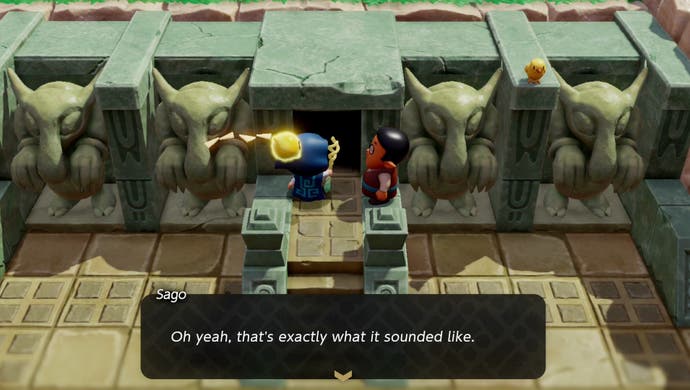 If you want this Heart Piece, you need to speak to the Sago, the man standing outside of the temple, and complete the 'Let's Play a Game' side quest. This involves heading into the temple and defeating Smog who you'll encounter at the end of the short dungeon.