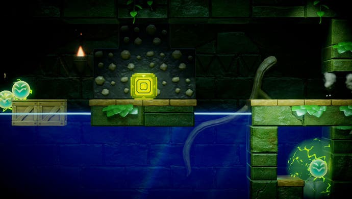 Afterwards, you'll reach a section with a pool of water and another yellow box. Here you need to hit it three times to unlock the next door.