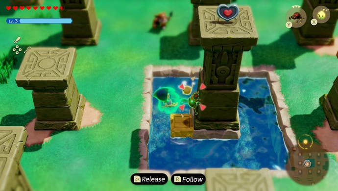 Upon their deaths, continue heading up the water tunnel until you finally reach the surface again. At this point, you need to use the Water Block Echo to create a water elevator to reach the nearby ledge. Now all you have to do is defeat a third Armos to ensure you can collect the Heart Piece safely.