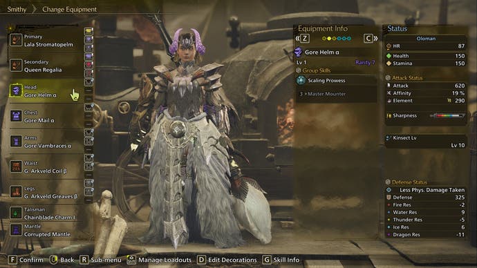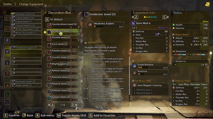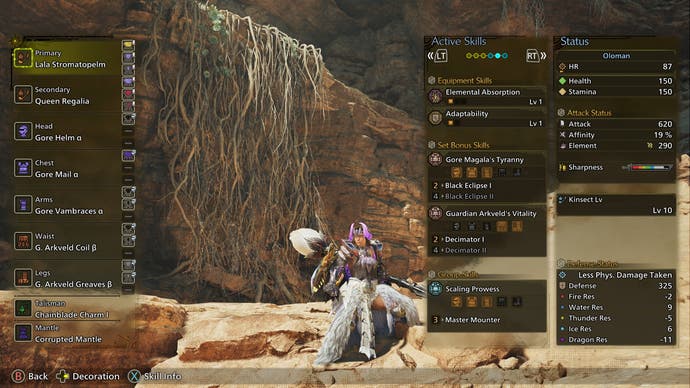 Now that we’ve got a complementary weapon and kinsect setup, it’s time to think about armour. Our recommended build is centered around the Gore Magala Beta armour set, due to the Master Mounter group skill it provides, which heightens the speed at which you mount and wound mounted monsters.