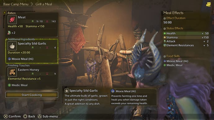 Last, but certainly not least, we have a meal for those who love getting stuck into fights, but want a safety net in case it all goes a bit awry. This meal combines the Meat's Attack boost with the healing benefits of the Sild Garlic and Eastern Honey, allowing you to increase the amount of health recovered when healing and to prevent fainting once respectively. It's essentially the heal meal, but with an Attack boost.
