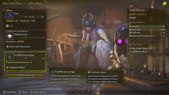 On the hunt for resources? Make sure to make this meal first. Most of this meal you can alter to your liking, but the most important part is the Truffle Du Conga, which grants the Gatherer Meal skill. This skill sometimes increases the number of resources per gather of bones, ore, and other gatherable items. It may only be sometimes, but it's worth using if you need resources quickly.