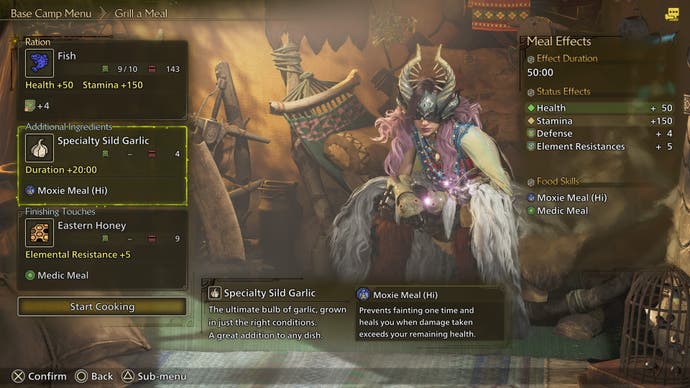 If you know you're going against a tough monster and want to give yourself a healing boost, this is the meal to make. Fish is a good basis, as it gives a Defense boost of +4, but it's the Speciality Sild Garlic and Eastern Honey doing the carrying. Speciality Sild Garlic grants the Moxie Meal (Hi) effect, preventing fainting one time and healing you when damage taken exceeds your remaining health. If you can also use the normal Sild Garlic for a less powerful version of this effect. The Eastern Honey then increases the amount of health recovered while healing, thanks to its Medic Meal effect. If you're prone to dying. Whip this bad boy up.