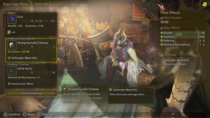Need a meal to boost your Defense? We've got just the ticket. The Fish boosts your Defense +4, while giving a standard Health and Stamina boost, too. Adding the Sharp Kunafa Cheese is the key part here, as it grants the Defender Meal (Hi) skill, often decreasing damage taken. You can use Kunafa Cheese instead, but it's less powerful. Finally, you can add the Wild Herb to grant the Immunizer Meal effect and lessen the effects of various ailments. This is a good, all-round defense meal.