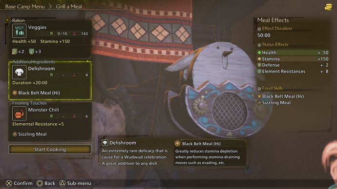 If you want to reduce Stamina depletion, this is the best meal you can make. We've chosen Veggies here for the Ration, but any will do, and the same goes for the Finishing Touches. The most important part of this meal is the Delishroom, which grants the Black Belt Meal (Hi) skill, greatly reducing Stamina depletion when performing Stamina-draining moves, such as evading. If you haven't got a Delishroom, a Droolshroom works too, but is less effective. If you want to focus more on evading than Stamina, use a Turbid Shrimp instead of a Delishroom, as it extends the invulnerability period when evading.