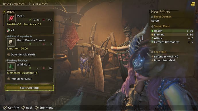 This meal is quite similar to the Defense meal, but includes the Veggie ration rather than the Fish. Replacing Fish with Veggies lessens the overall Defense boost, but increases the Element Resistances stat. The Sharp Kunafa Cheese still gives you a Defense boost, so you aren't too exposed, while the Wild Herb gives an extra few Element Resistances points and helps ward off pesky ailments. If you want a meal more specific to climate effects, though, check out the meal below.