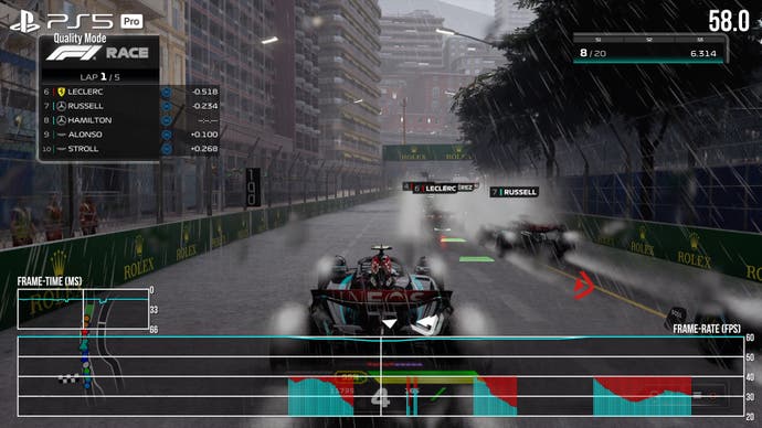 Frame-rate testing next, and, despite the addition of ray tracing the good news is that quality mode's 60fps lock isn't affected. In the heat of a race, 99 per cent of play runs absolutely flawlessly: from the Azerbaijan route, to the Albert Park Circuit during rainfall. As an extreme case, Monaco in heavy rain is the real litmus test, and here it almost passes with flying colours. With all AI cars in view at the starting grid, PS5 Pro does briefly drop to 58fps to start, with full-screen tearing. It's a momentary drop though, and once we splinter away from the pack, 60fps is in frame again. The only other issue on this track is the occasional hitches in this pre-final build we tested on the Pro dev kit. The team is well aware of the issue though and aims to address it ahead of the PS5 Pro patch rolling out. Besides this, every other circuit flies at 60fps with ray tracing engaged. It's optimised well for 60fps on PS5 Pro - a testament to the careful choice of RT technologies and the use of PSSR as a means to strike a 4K image while not losing out on the frame-rate side.