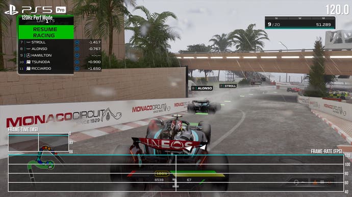 Testing PS5 Pro's frame-rate at 120fps, the turnout is capably hits the mark. On every track tested so far there's barely a blip en route, even including the Monaco circuit as our extreme stress test. That said, there are some exceptions. Turning into a pitstop for repairs triggers a minor bout of frame drops - to 115fps lowest, with full-screen tearing. There's also very occasional one frame drops during gameplay, but nothing that massively detracts from the experience. And once again, performance mode has an odd set of behaviours during pre-race sequences and replays. Generally these lock at a 40fps cap much like the quality mode (and 40fps makes much more sense with 120Hz as the output here), but ending or retiring from a race triggers the engine to run fully unlocked to 120 frames per second. Much like base PS5, these automated, post-race moments engage ray tracing for ambient occlusion, reflections and DDGI. The net result is, we get to see - even if just briefly - how PS5 Pro would run with these RT technologies with a 120fps target. The reality is that we're hovering at the 70-90fps range, and that being the case, disabling these options for gameplay itself seems a sensible call.