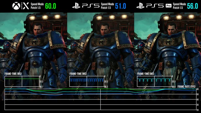Looking at the speed mode's actual performance next, PS5 Pro nudges the reading even closer to the target 60fps. This isn't an absolute lock at that top number by any means, especially once engaged in battle with multiple tyranids, but it is a boost in most respects over the base PS5 reading. In comparing the two machines, both updated to patch 1.5, we're looking at up to a 5fps gain during the opening cutscene as we land on the battlefield. From here onwards, the delta widens further to show a 10fps advantage on PS5 Pro in battle. At times it's even higher, though gameplay becomes increasingly tricky to sync up exactly. Alas, it's also hard to ignore the lingering drops on Pro: we're still seeing lurches to 45fps, just as enemies emerge from their pods on the opening jungle planet. Also, while improved, we're still generally operating in the 50-60fps range during set-pieces involving swarms of enemies. In short, all of this puts PS5 Pro more often at 60fps than base PS5, and ensures that the frame-rate remains within the 48-60 VRR window more often - but it's not a lock.