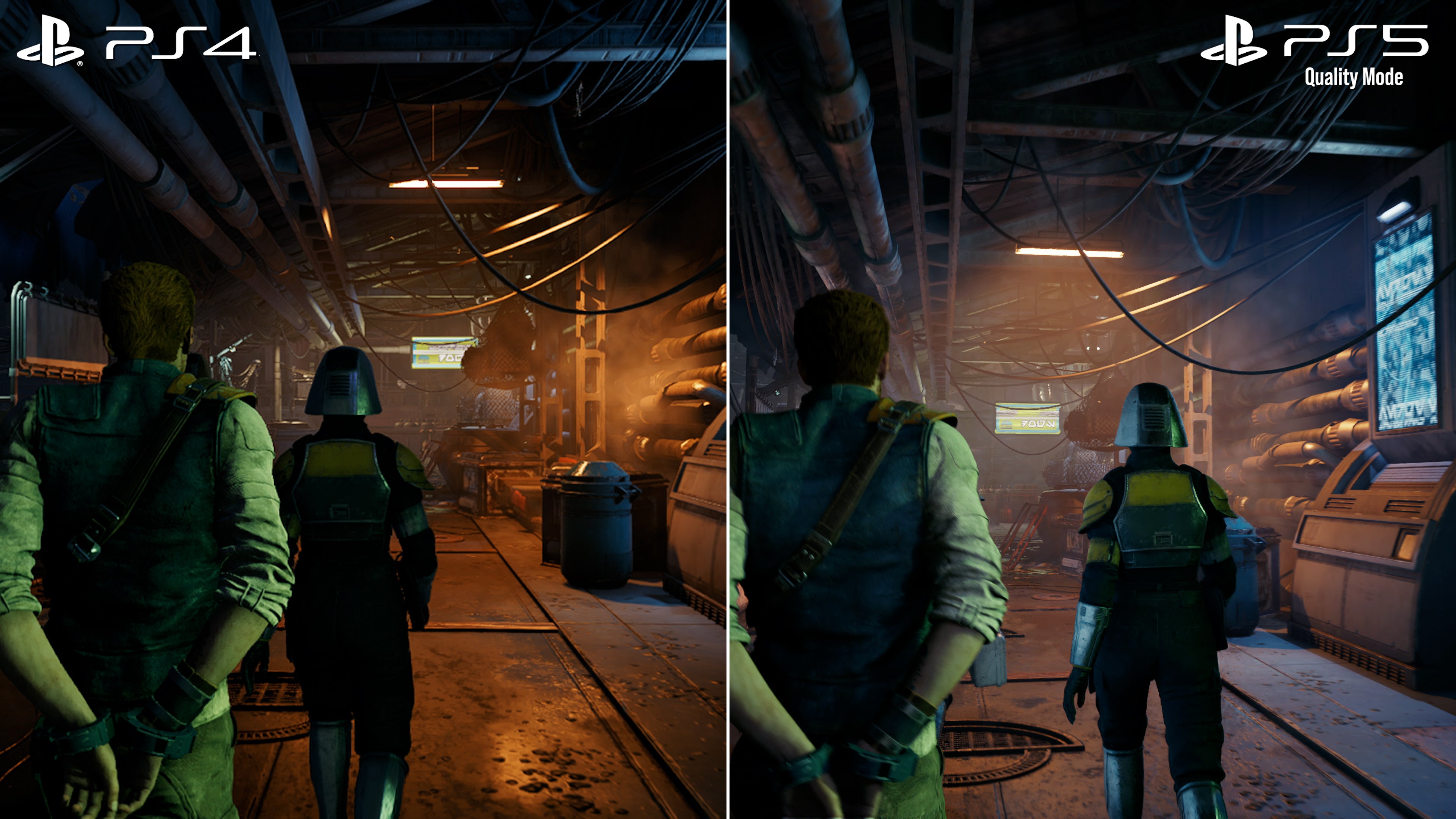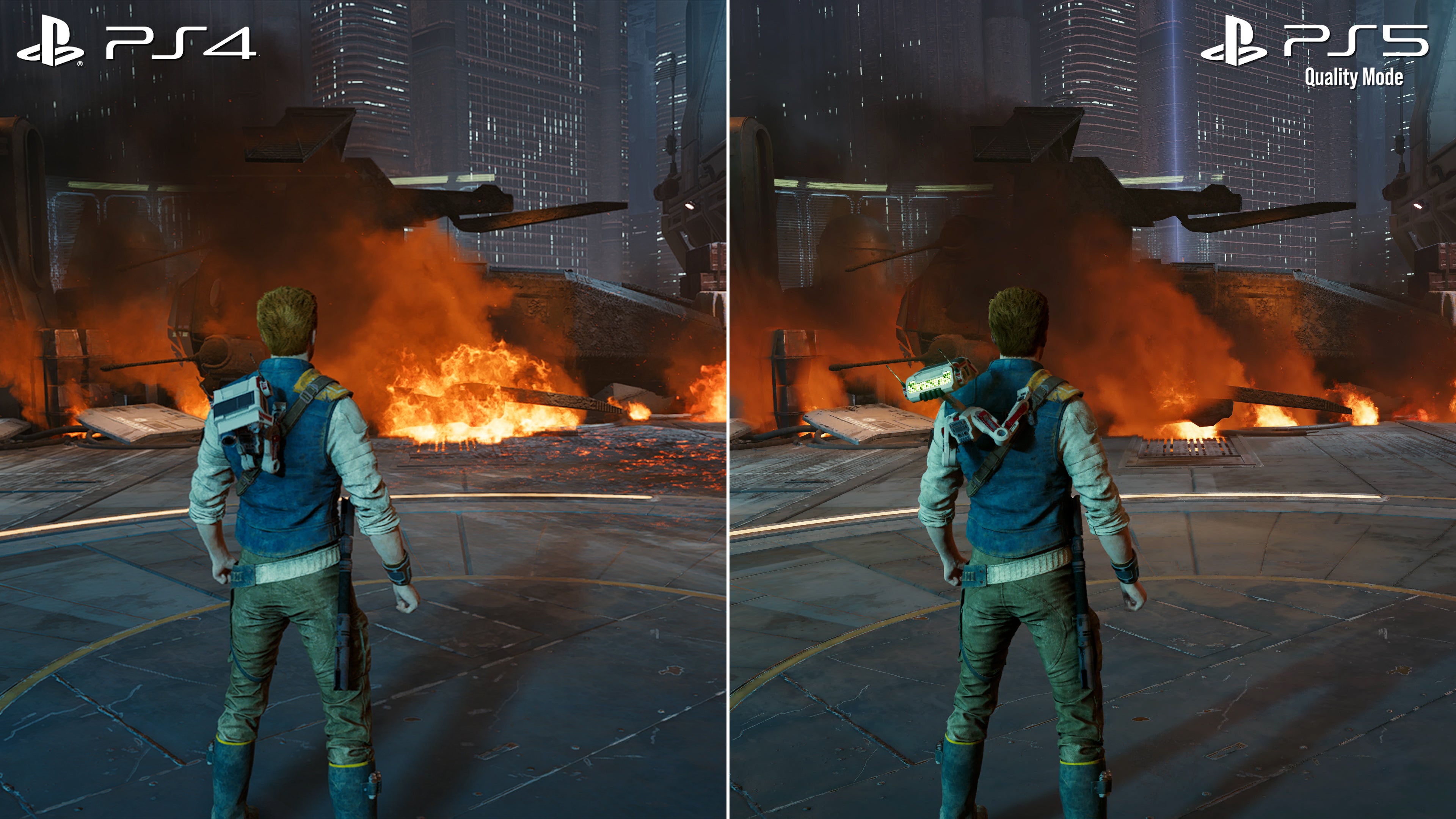 Jumping to performance testing, PS4 runs surprisingly well overall in gameplay thanks to its many cutbacks. Be it the open world roaming around Koboh or the stormtrooper battles in the city, 30fps is a generally well-met target. There are clear hiccups at points though, usually related to asset streaming during quick movement. Really, this is a trend for PS4's delivery as a whole; as we emerge to a broad overview of the city, the frame-rate tanks suddenly. It hitches as new assets load in, coupled screen-tearing at the top 20 percent of the display, plus uneven frame-pacing. There are less intrusive cases of this later on, where just running at pace outdoors will trigger a bout of uneven frame-pacing and tearing - before it re-stabilises at 30fps. The result in action is usually robust on PS4 but these lapses in stability do often stick out. Otherwise, impressively, PS4 is able to run at a more stable frame-rate at times, compared to PS5 on its quality mode, where RT effects can hit performance hard. So yes, in moments involving RT reflections on Koboh, PS4 will run more optimally at 30fps than its next-gen successor - but those streaming issues still need addressing.
