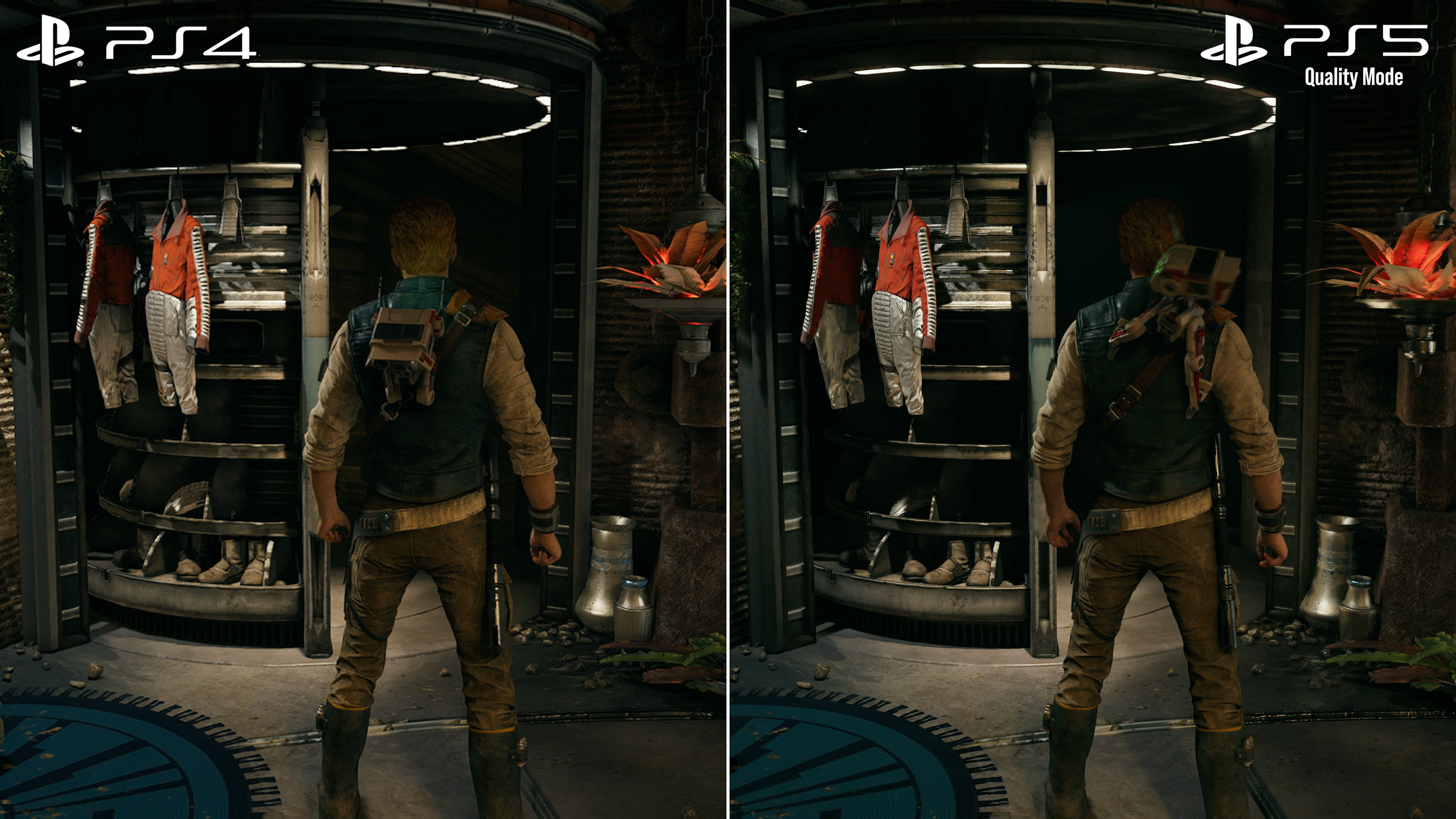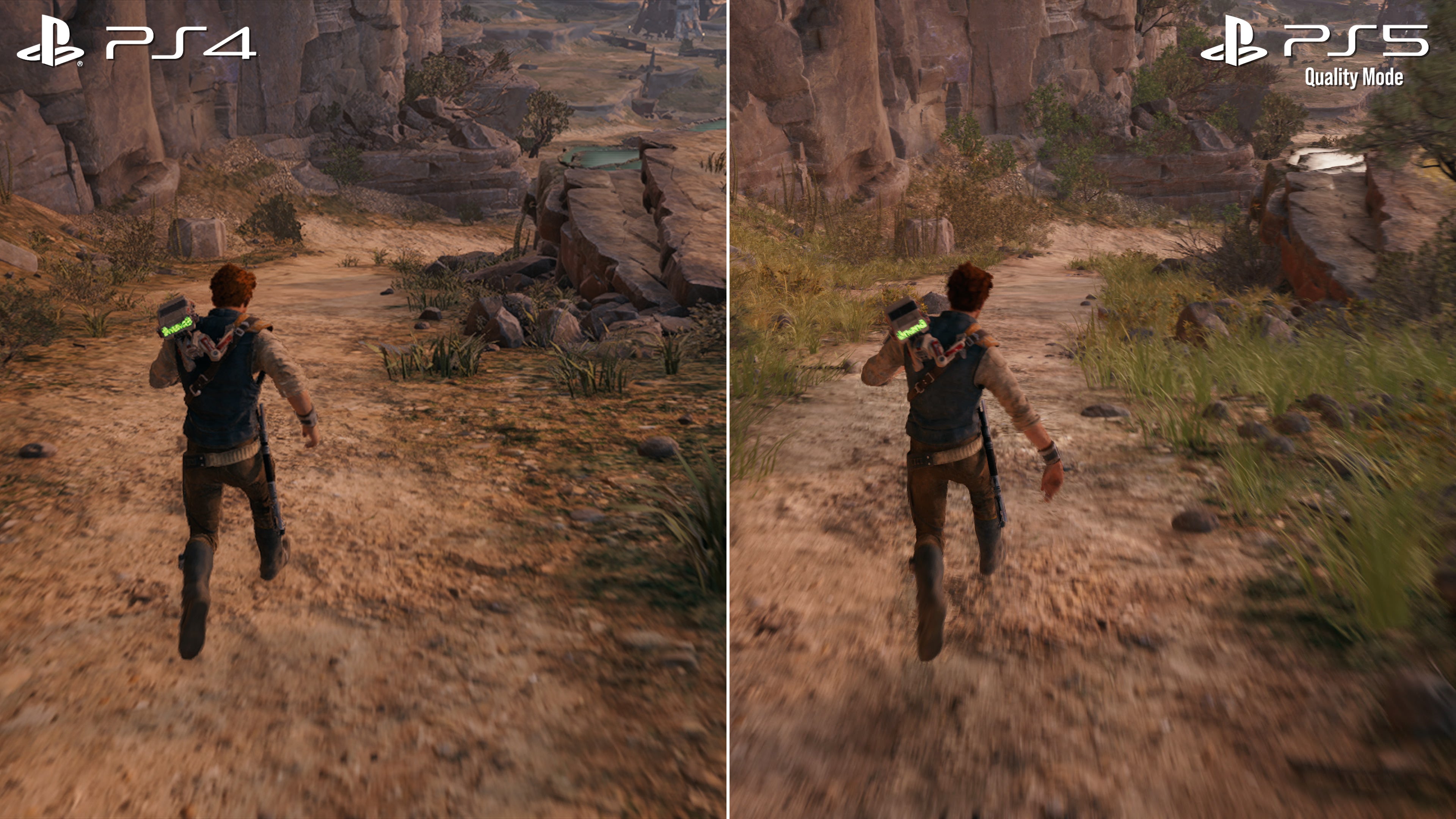 Moving on to the bad news, texture quality takes a hit. Across most surfaces around Koboh, you'll spot a dip in asset quality up close, where ground materials, skin shaders, and even the cloth and hard table tops around Pyloon Saloon all use lower res assets. Shadows inevitably get dropped a grade too, resulting in a more pixellated silhouette to Cal - which is at least filtered for a more presentable result. In terms of transparency effects - like fire and sparks - there's also a big cutback in fidelity on PS4; not only does the resolution take a hit, but certain effects also run at 15 frames per second - half the refresh of the intended 30fps. It's truly jarring to see in motion. This goes for every last-gen platform, and worse still, this 15fps update also applies to menus and HUD elements while using meditation points. Finally, you'll notice a much lower grass density setting in exploring the open world. Around Koboh, foliage density is the same on all last-gen platforms, but compared to PS5 it's significantly pruned back. Unlike the texture situation, this foliage setting drop sticks out starkly in jumping between generations.