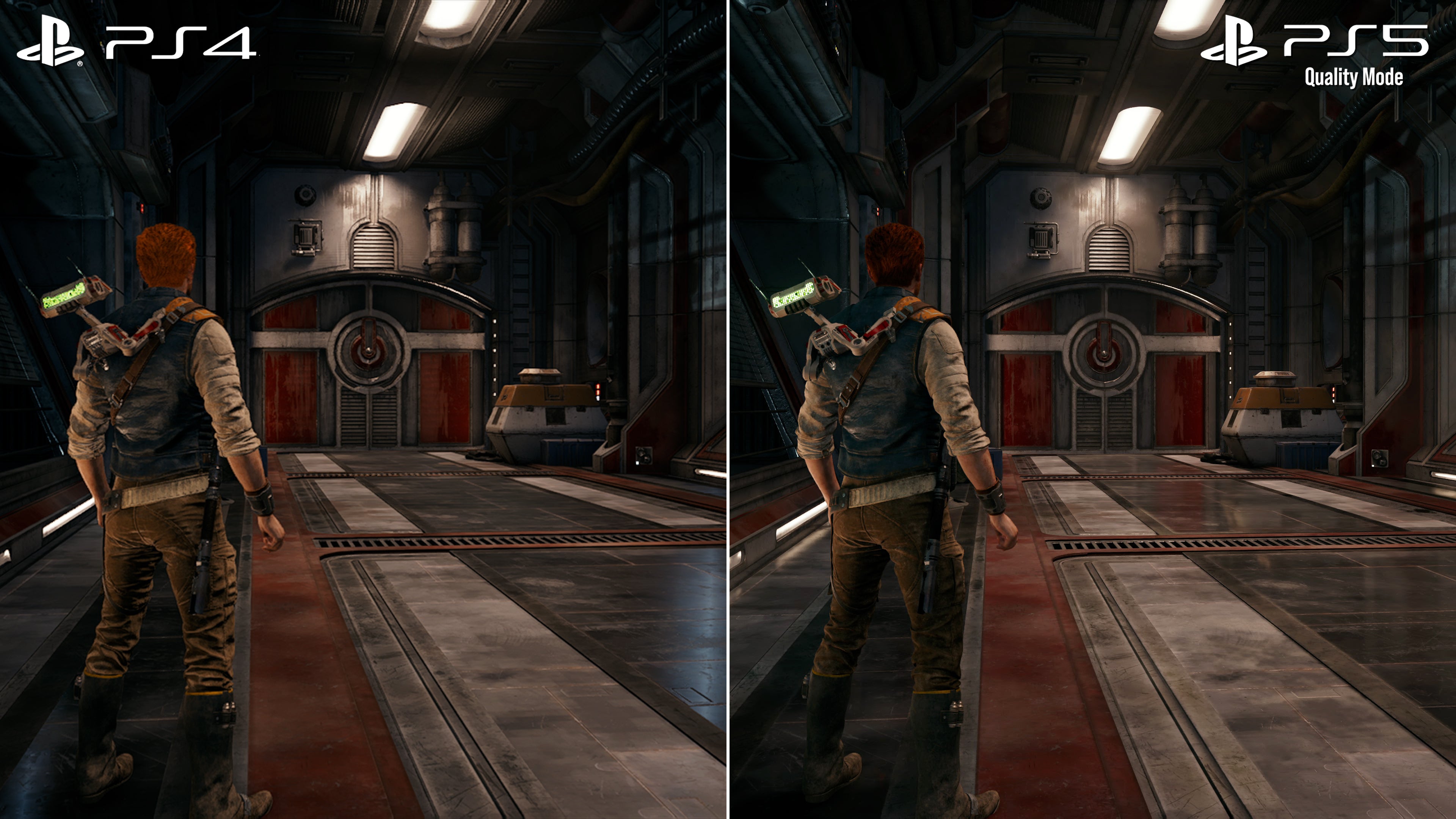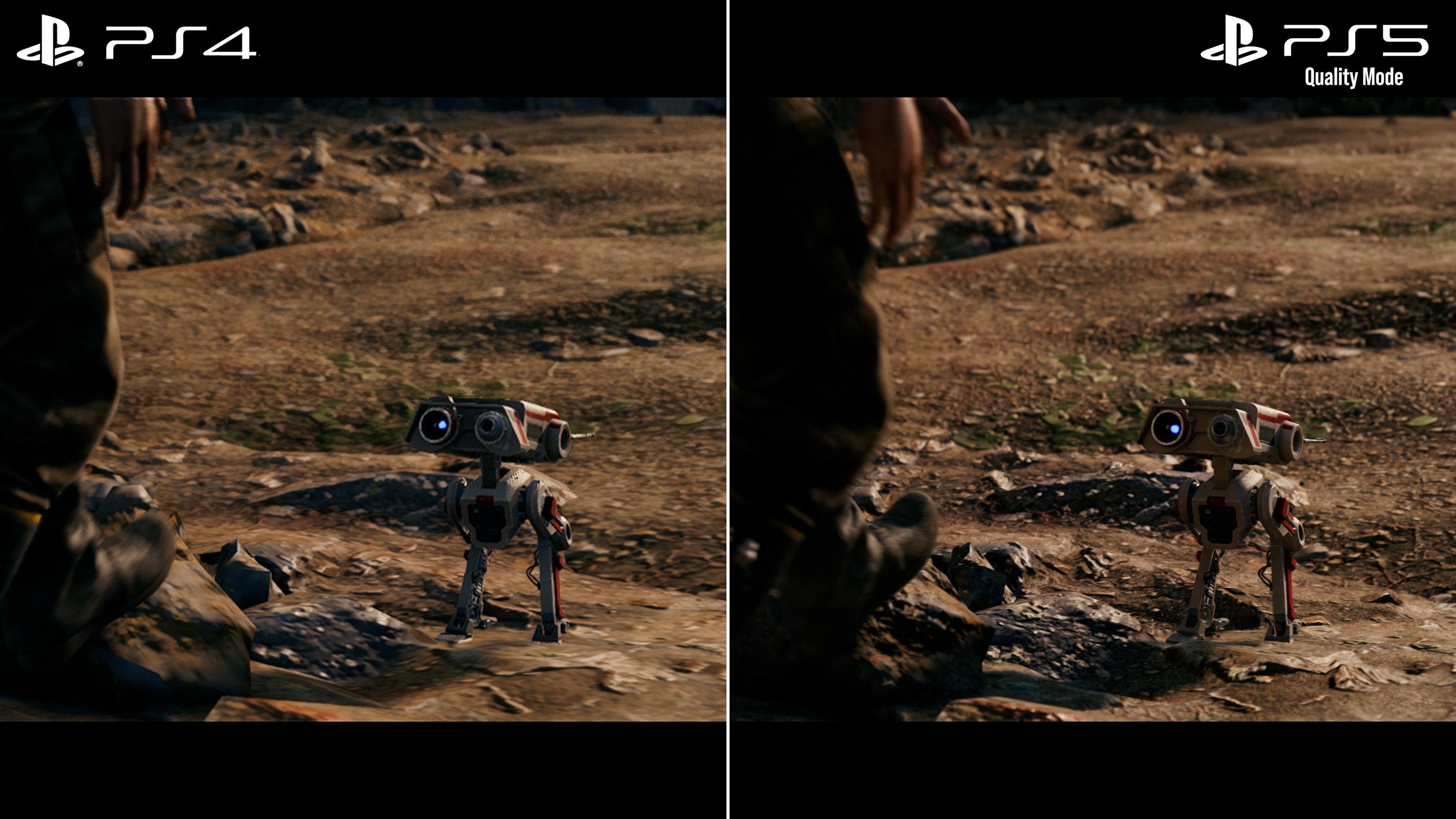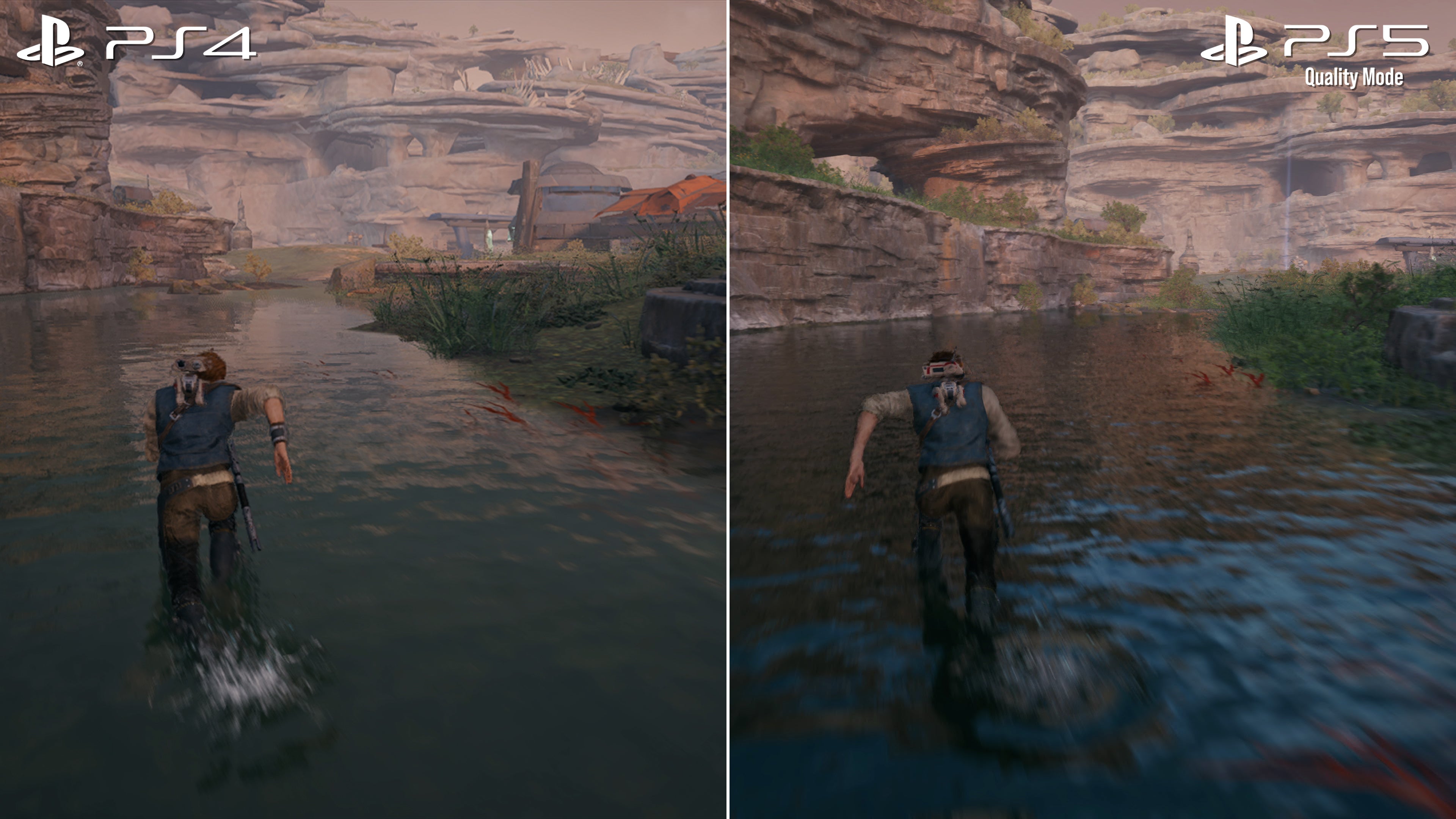 There's no ray tracing here of course. PS5's quality mode continues to benefit from an enhancement in light bounce - via RTGI - around shaded elements of the world. Switching from PS4 to PS5 and back again, there's no question that the last-gen machine loses out, and with a drop in ambient occlusion quality too, creating a lighter, less thoroughly shaded result. Likewise, in terms of reflections, PS5 benefits from the more taxing ray tracing approach on quality mode. PS4 - and indeed PS4 Pro, Xbox One and One X - all instead rely on cube mapped textures around Coruscant city, fixing a static mirror image across its glossy floors. In the end, reflections end up working much like PS5's 60fps performance mode - with no interaction from characters running on top. However, once we arrive on Koboh, the upside is that all last-gen consoles deploy screen-space reflections (SSR) across water bodies - again much like the PS5 performance mode. It's a genuine surprise, and while not on par with the accuracy of PS5 ray traced approach, SSR does make the grade.