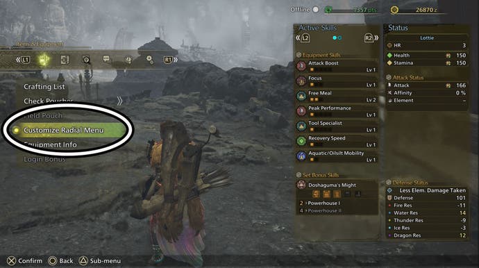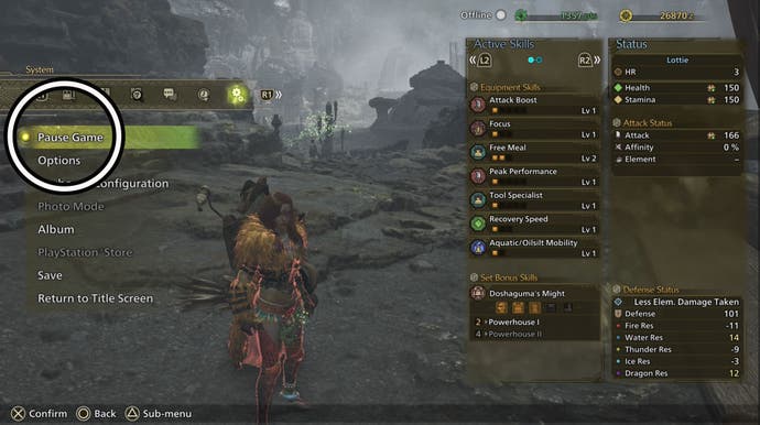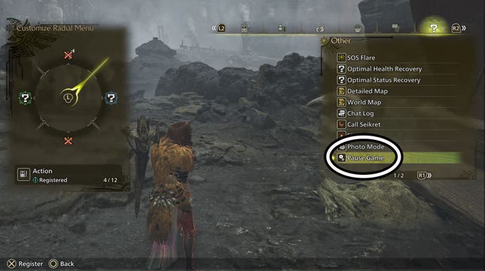 You can add 'Pause Game' to your Radial Menu, which itself can be easily pulled up wherever and whenever you are in Monster Hunter Wilds. This is ideal for pausing the game in the middle of a monster hunt as it's far easier, and quicker, to access your Radial Menus.