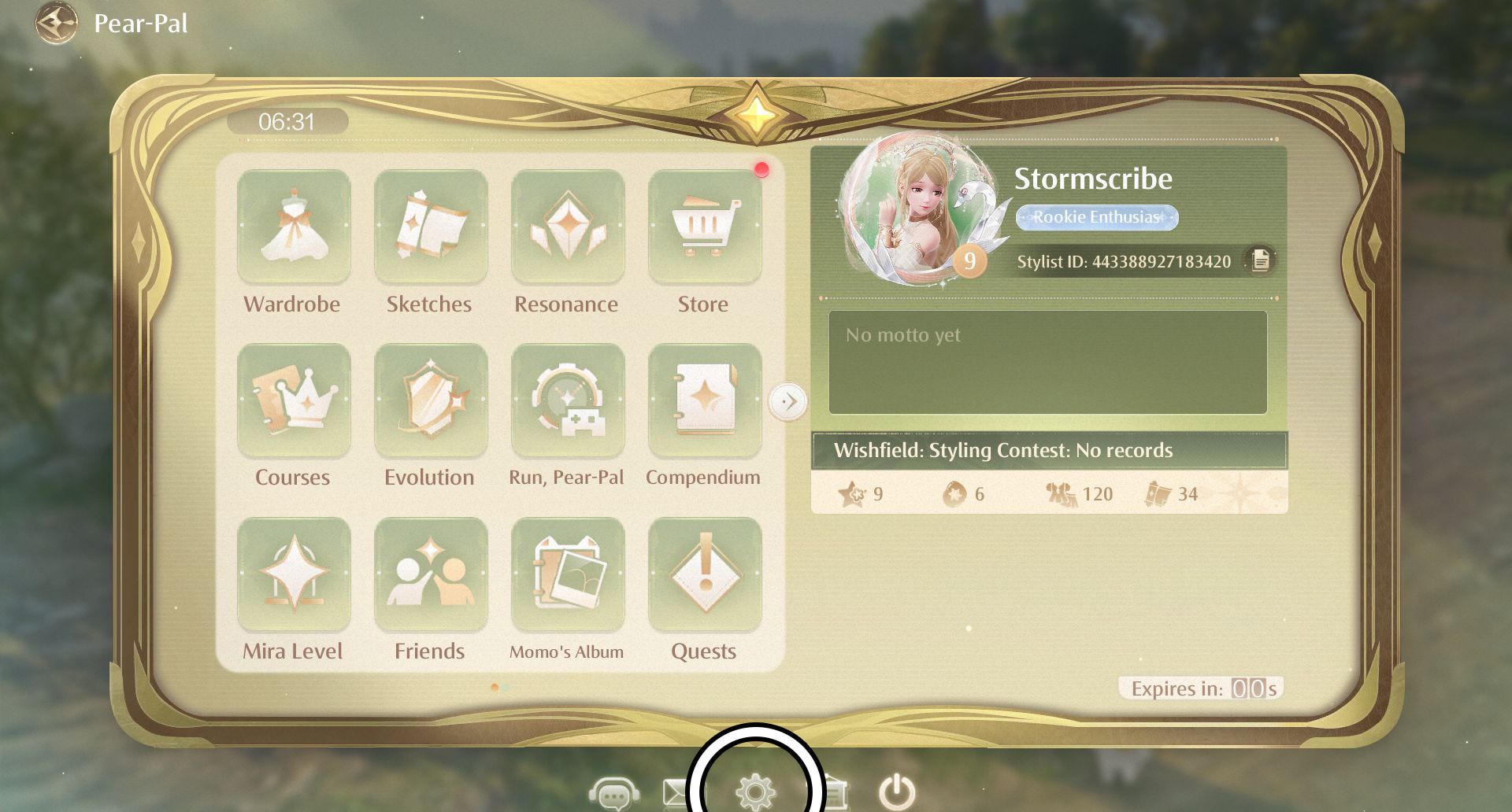 To redeem an Infinity Nikki code, you first need to open your Pear-Pal. (If you don't have the Pear-Pal yet, then meet up with Dada Florawish Stylist's Guild - it doesn't take long to reach this point in the story at all.) After doing so, you'll be able to see a gear icon sitting in the middle of four icons directly below the Pear-Pal itself. The next step is to click on this gear icon.