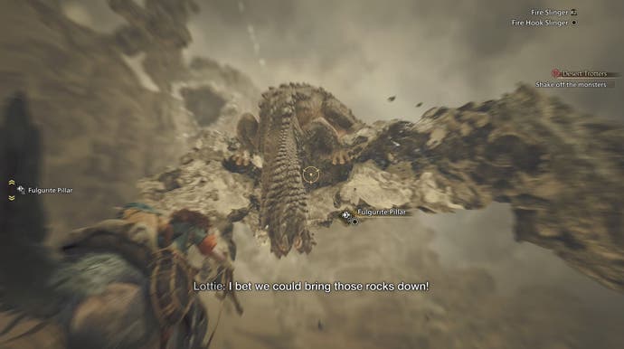 After a short cutscene, you'll be riding your Seikret again. It will continue finding its own path, allowing you to focus on the monsters surrounding you by firing your Slinger once again. You'll quickly come to a spot where a monster is hanging down from a stone pillar and you can pull this down by using your Slinger.