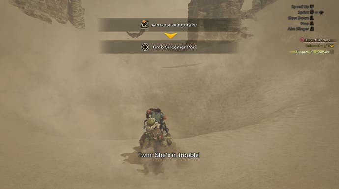The mission begins with you chasing after a girl on the back of a Seikret. You don't have to worry too much about controlling the Seikret here as it will automatically follow the girl. What you do need to pay attention to, however, are the Wingdrakes. These will make an appearance after the girl gets caught in some quicksand.