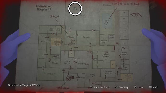 The Small Chest is located inside the tiny enclosed seating area found in the northwestern side of the Garden in Brookhaven Hospital, which you get access to after finding the 1F Inner Ward Key on your way to solving the Hand puzzle. Crawl through a gap at the back to get into the small seating area.