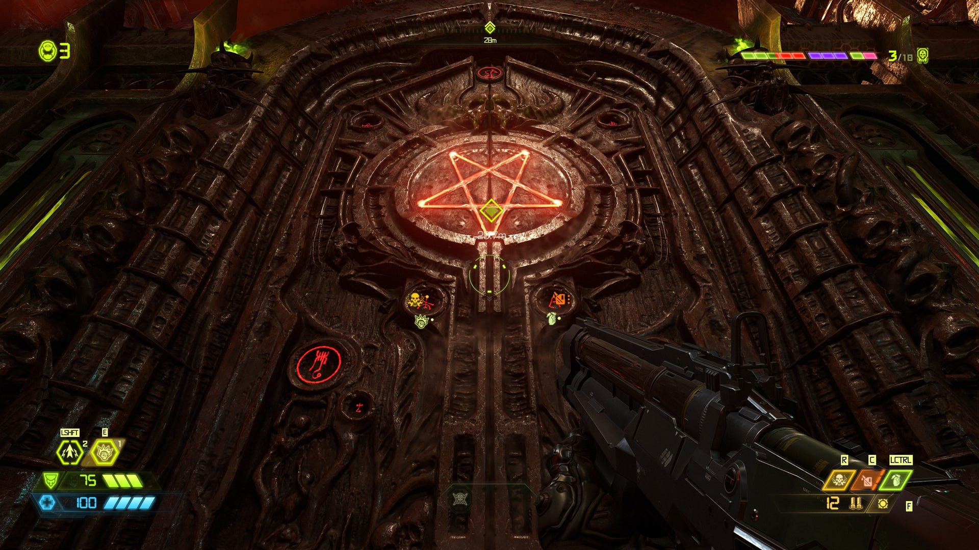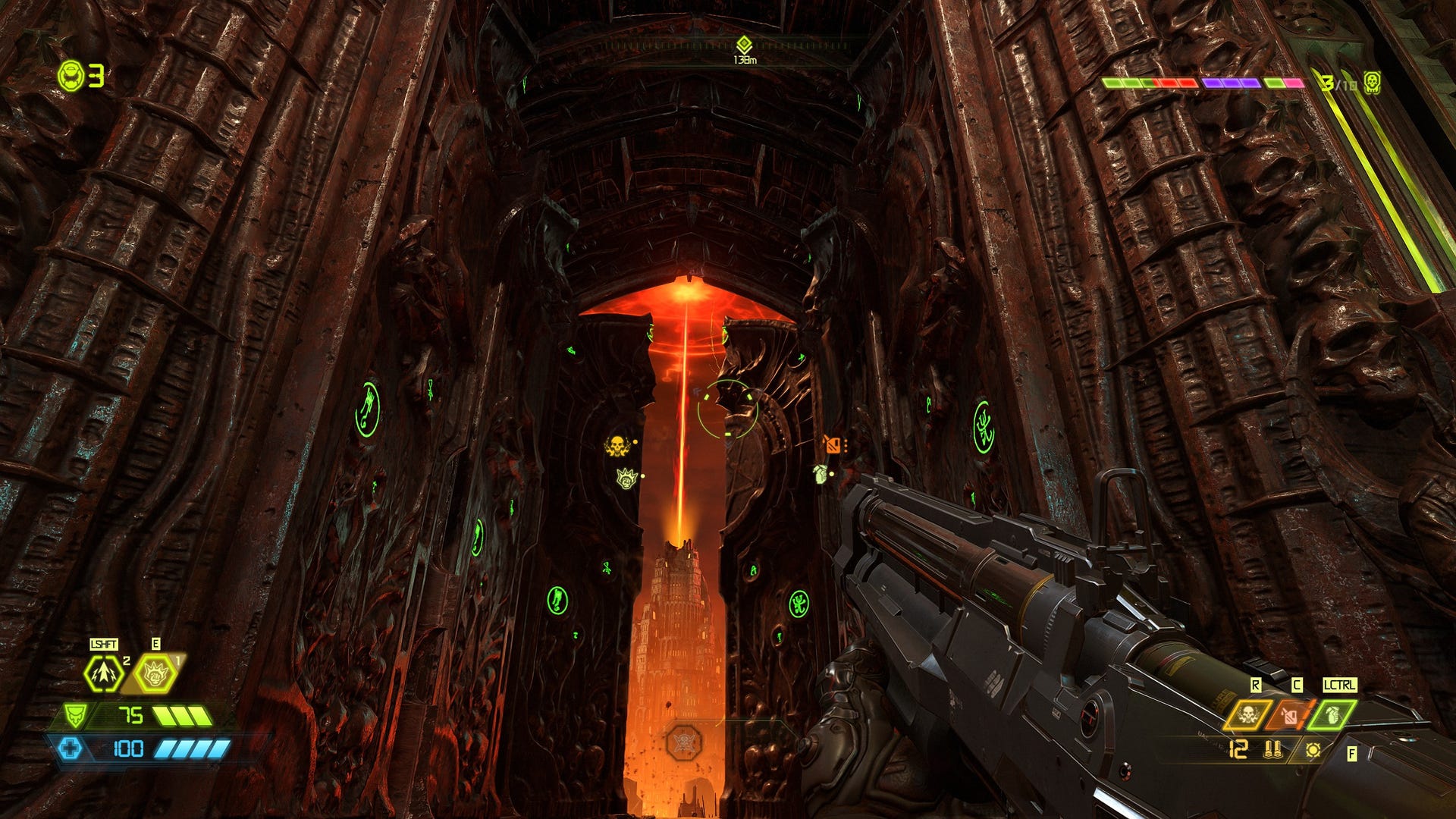And the doors! There's a moment early on in Eternal where you need to open a huge Hell door in order to get somewhere - the kind of door designed for a 30-foot being of some unholy kind (ie. the best kind of fantasy door) to walk through. But instead of opening only one colossal door, Doom Eternal instead opts to open three, in a carefully choreographed rhythm, one after another, thump-thump-thump, until a tower with a beam of orange light zapping down on it is framed in the distance beyond. This sequence is everything Doom Eternal does in microcosm:- knows what you're expecting and overdelivers on it. It's about as subtle as a pantomime.