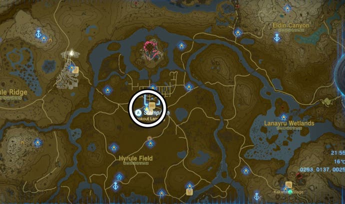 The Lookout Landing Skyview Tower is helpfully located in Lookout Landing, which can be found just south of Hyrule Castle in Zelda: Tears of the Kingdom. Its exact coordinates are -0293, 0137, 0025.