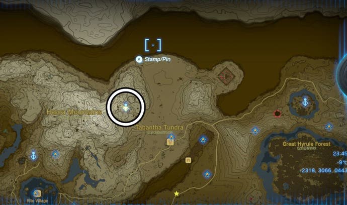 The Pikida Stonegrove Skyview Tower is located within the eastern foothills of the Hebra Mountains, north-east of the Tabantha Tundra and the Snowfield Stables. Its coordinates are -2318, 3066, 0443.