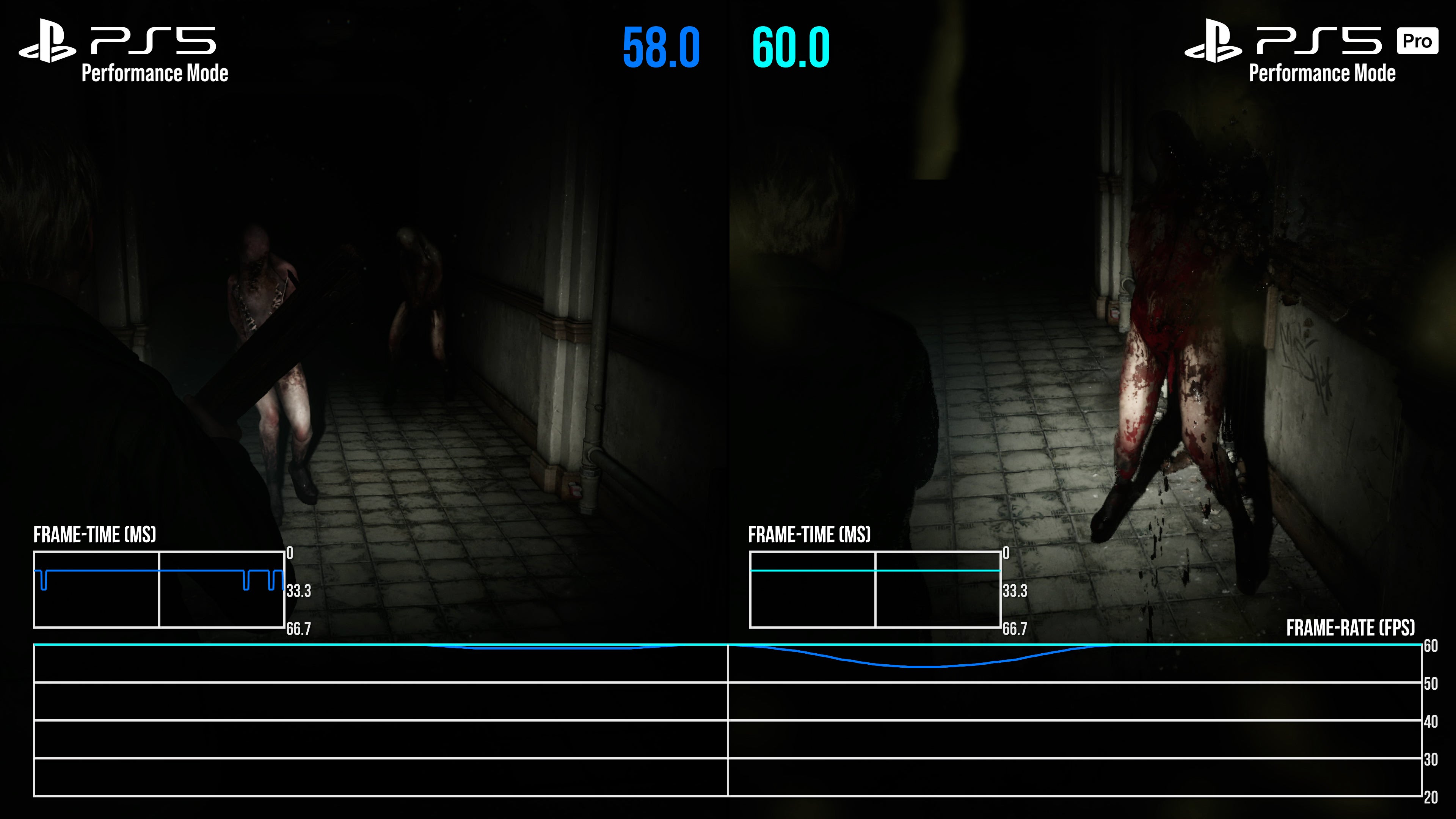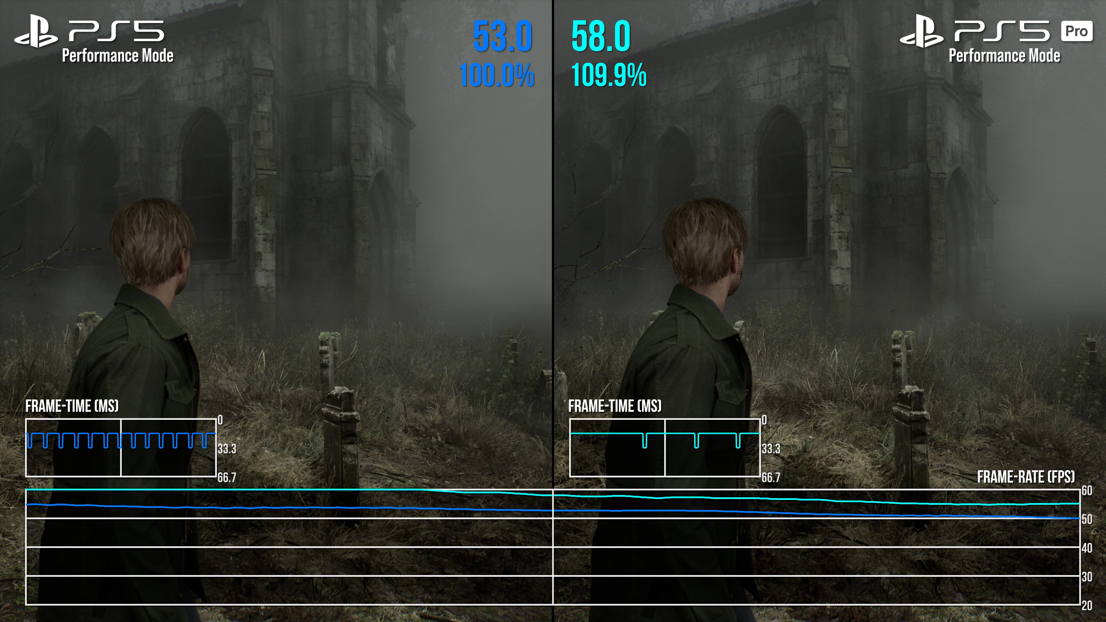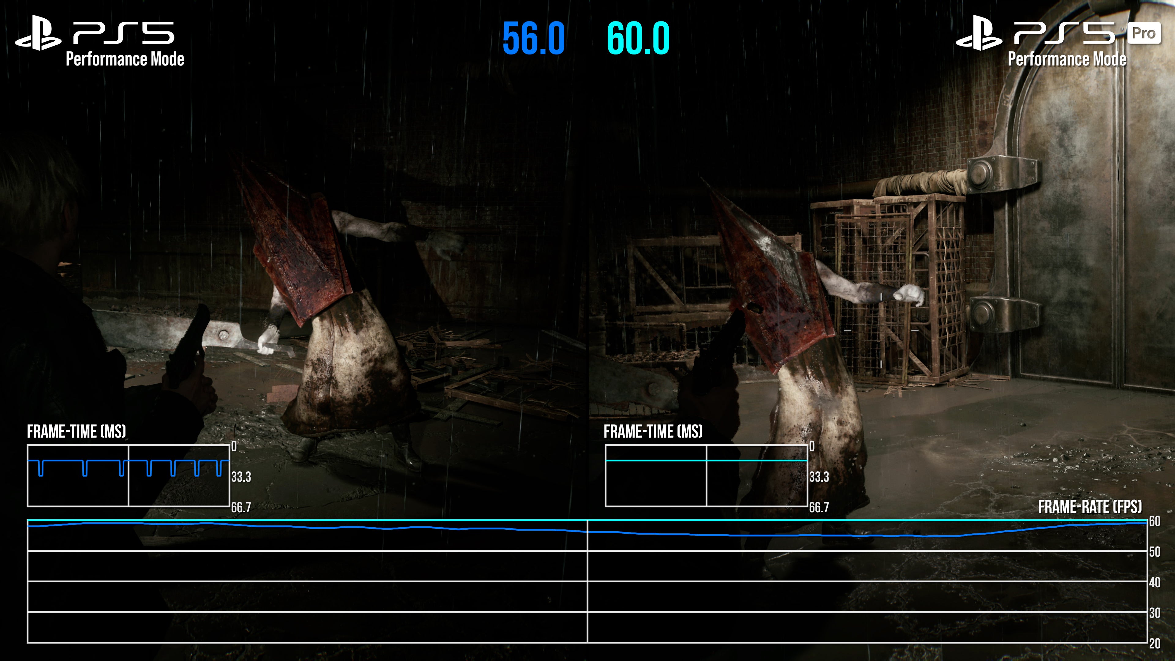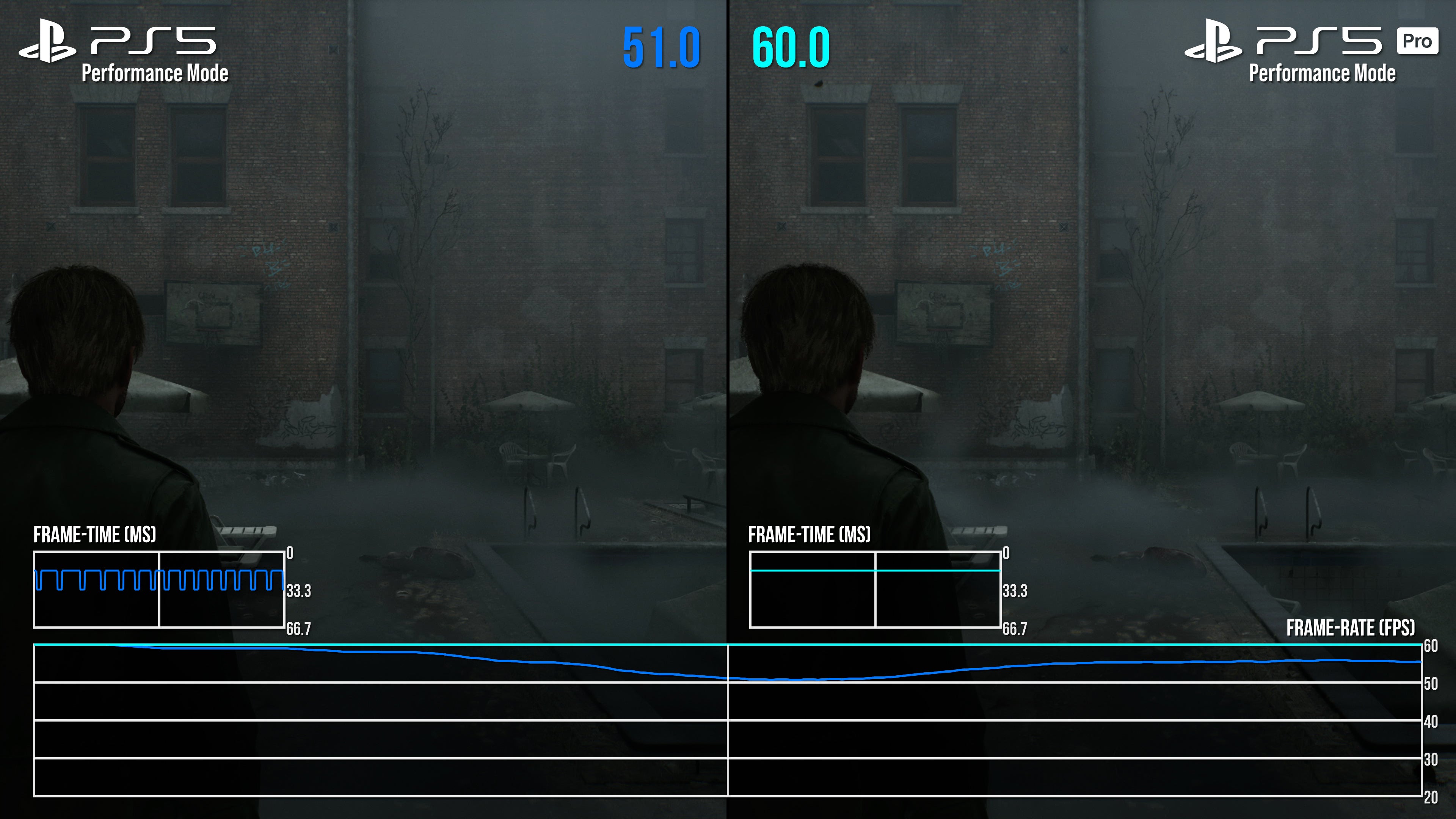It's a mixed bag then, but there is some good news on the frame-rate side. Above all else, PS5 Pro offers a smoother 60fps experience, plus a much more stable 30fps mode than base PS5. In part, this is thanks to the fixed, static nature of the resolution now in place on each mode - at either 900p or 1080p, depending. Taking the 60fps mode in example first, we of course no longer have DRS trying to maximise the pixel count in every scene, which could lead to frame-rate drops on base PS5. Simply put, any time we turned to a more GPU-taxing part of the scene, there'd be a single, or small batch of dropped frames as the pixel count adjusted in that moment. Base PS5 always needed a second to adjust to the GPU load, if caught off guard by player movement. Not so on PS5 Pro: between Silent Hill's South Vale region, the apartments, and even battling Pyramid head, the fixed resolution target is more dependable. As a result, many of the sub-60fps drops and hiccups present on the performance mode are now cleaned up to create a tighter, if not 100 percent perfect 60fps line.
