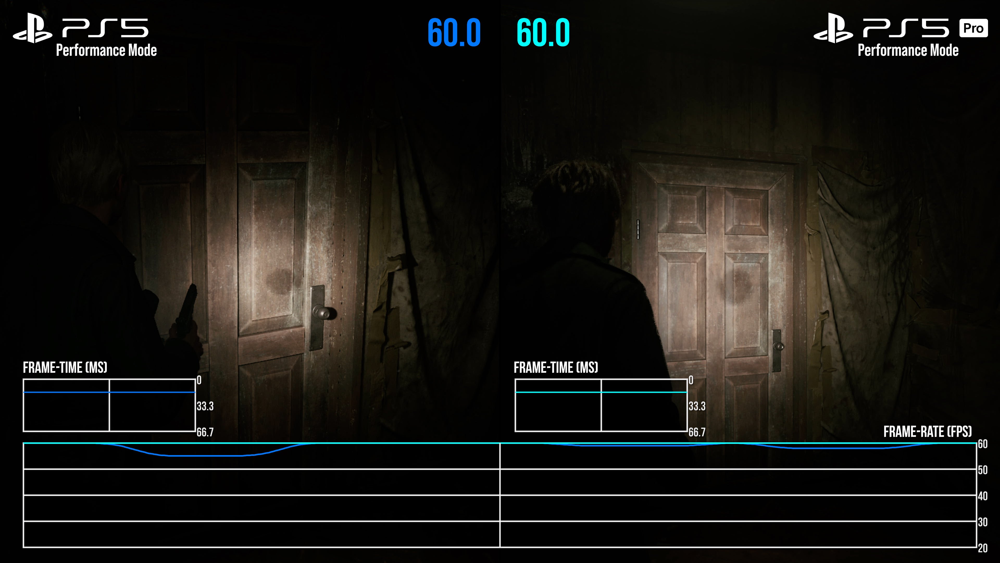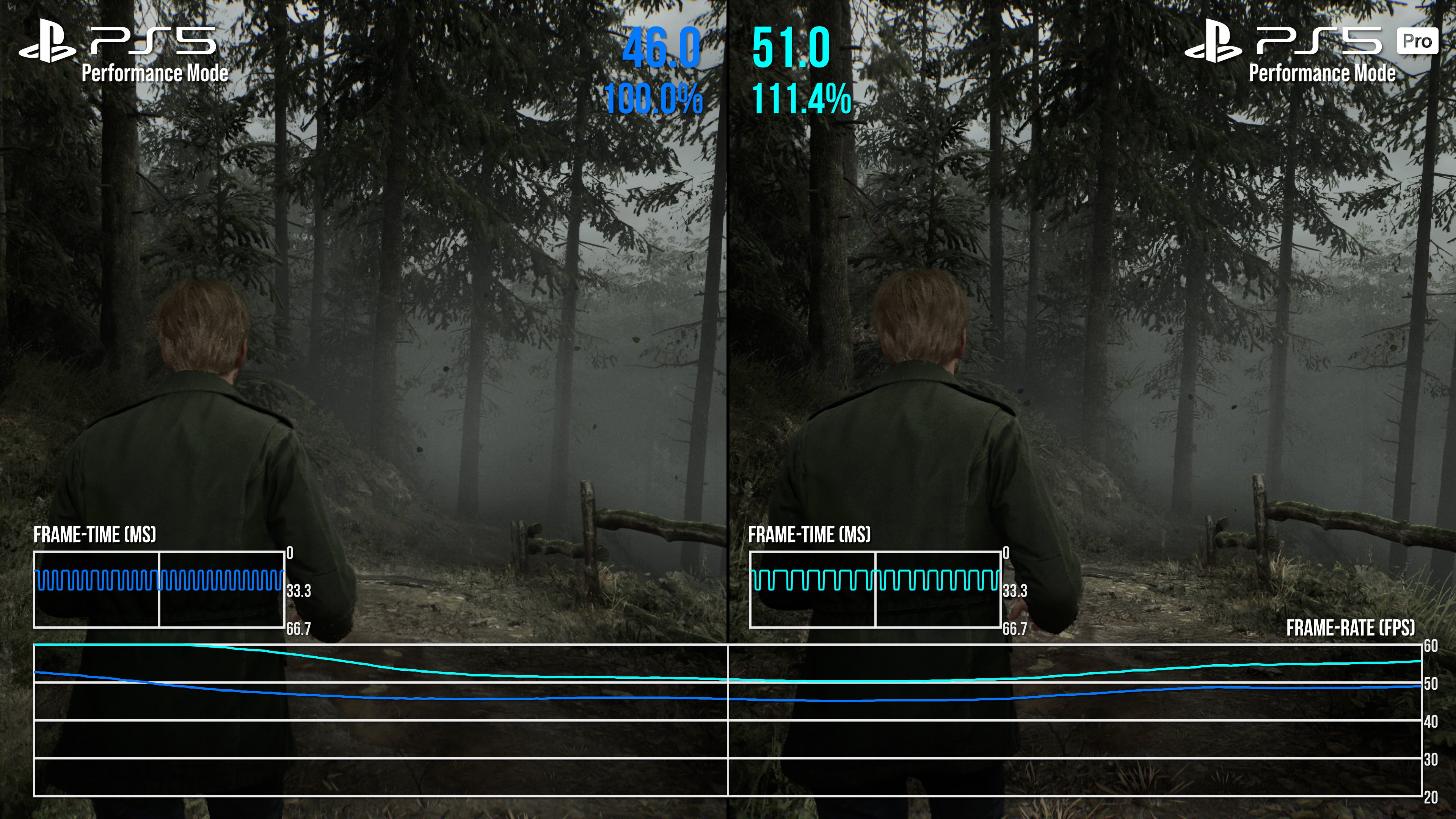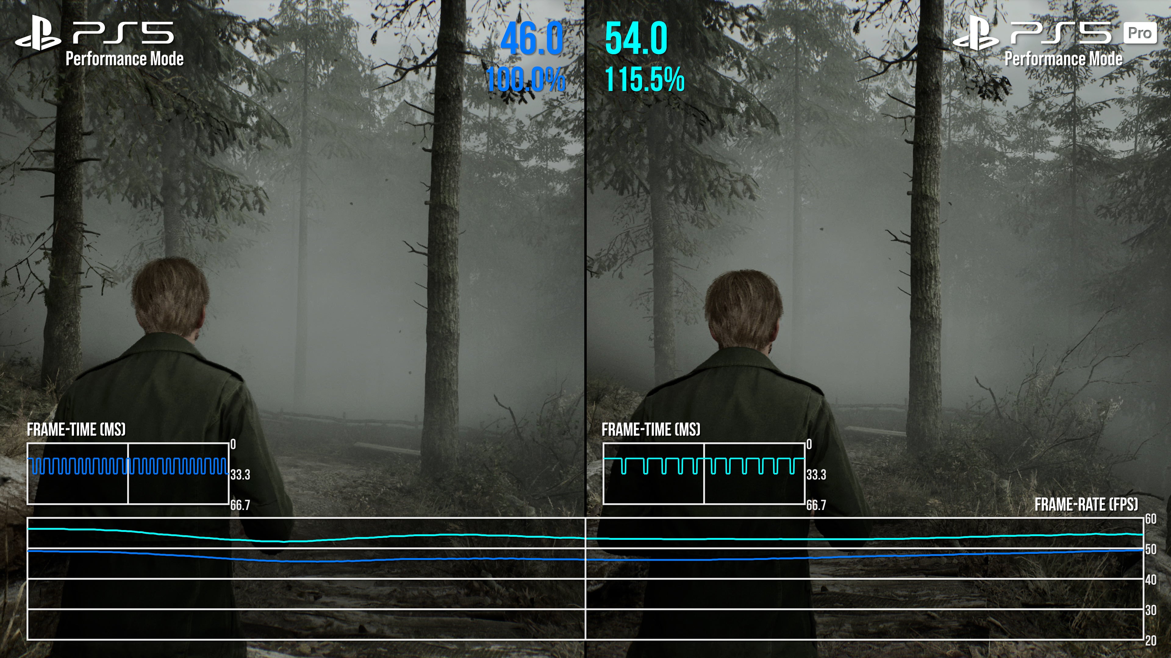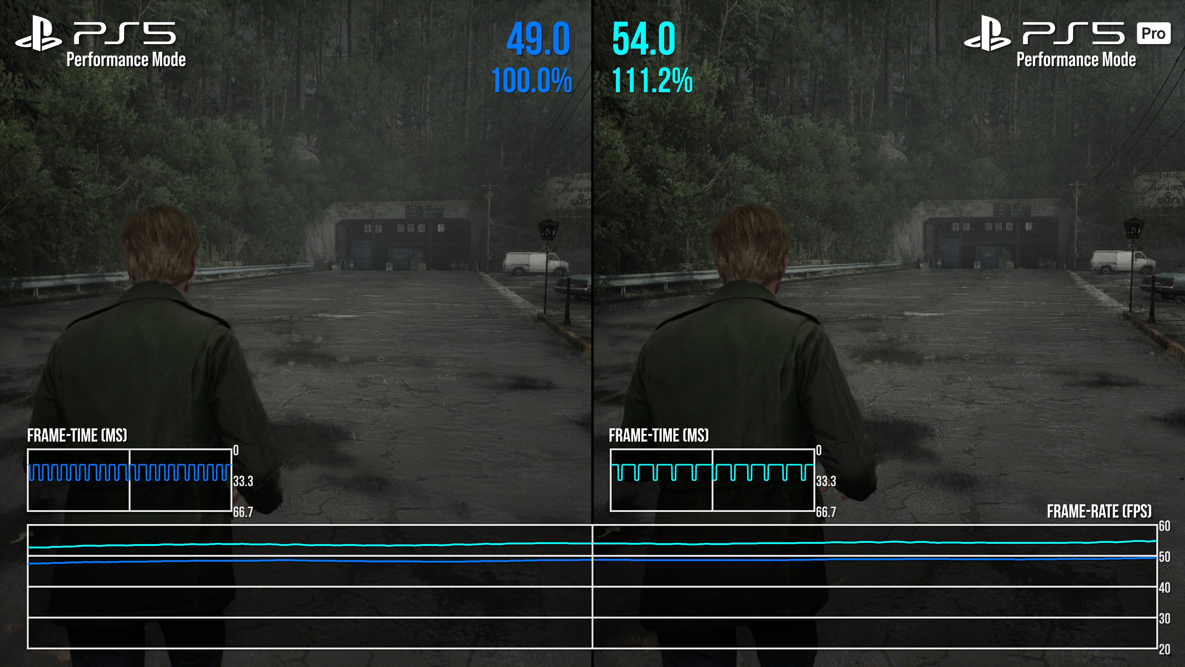 It's a mixed bag then, but there is some good news on the frame-rate side. Above all else, PS5 Pro offers a smoother 60fps experience, plus a much more stable 30fps mode than base PS5. In part, this is thanks to the fixed, static nature of the resolution now in place on each mode - at either 900p or 1080p, depending. Taking the 60fps mode in example first, we of course no longer have DRS trying to maximise the pixel count in every scene, which could lead to frame-rate drops on base PS5. Simply put, any time we turned to a more GPU-taxing part of the scene, there'd be a single, or small batch of dropped frames as the pixel count adjusted in that moment. Base PS5 always needed a second to adjust to the GPU load, if caught off guard by player movement. Not so on PS5 Pro: between Silent Hill's South Vale region, the apartments, and even battling Pyramid head, the fixed resolution target is more dependable. As a result, many of the sub-60fps drops and hiccups present on the performance mode are now cleaned up to create a tighter, if not 100 percent perfect 60fps line.