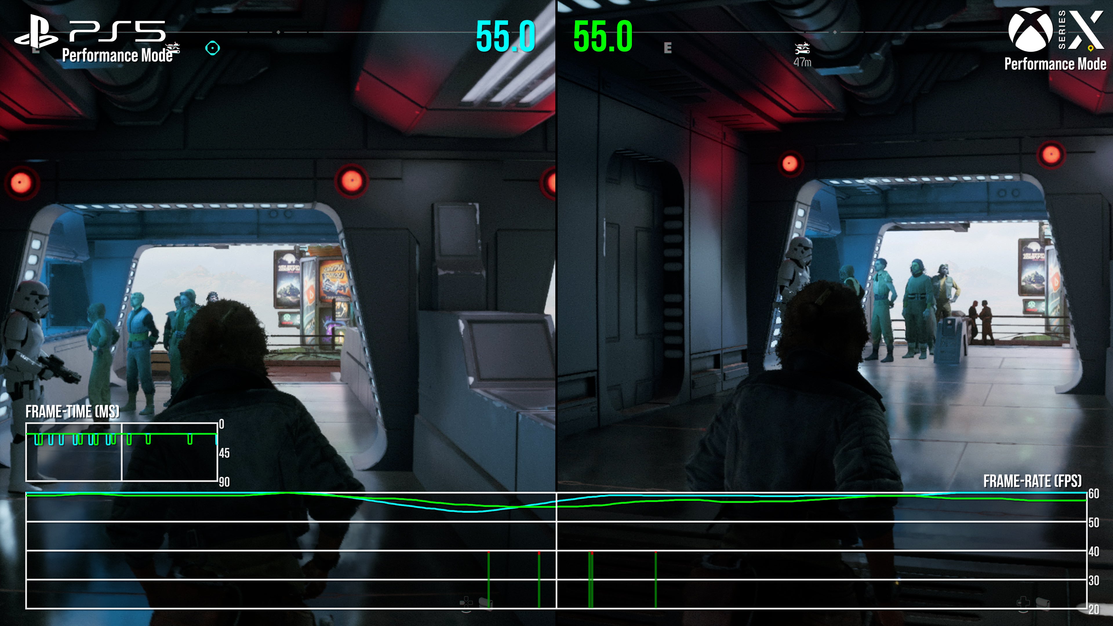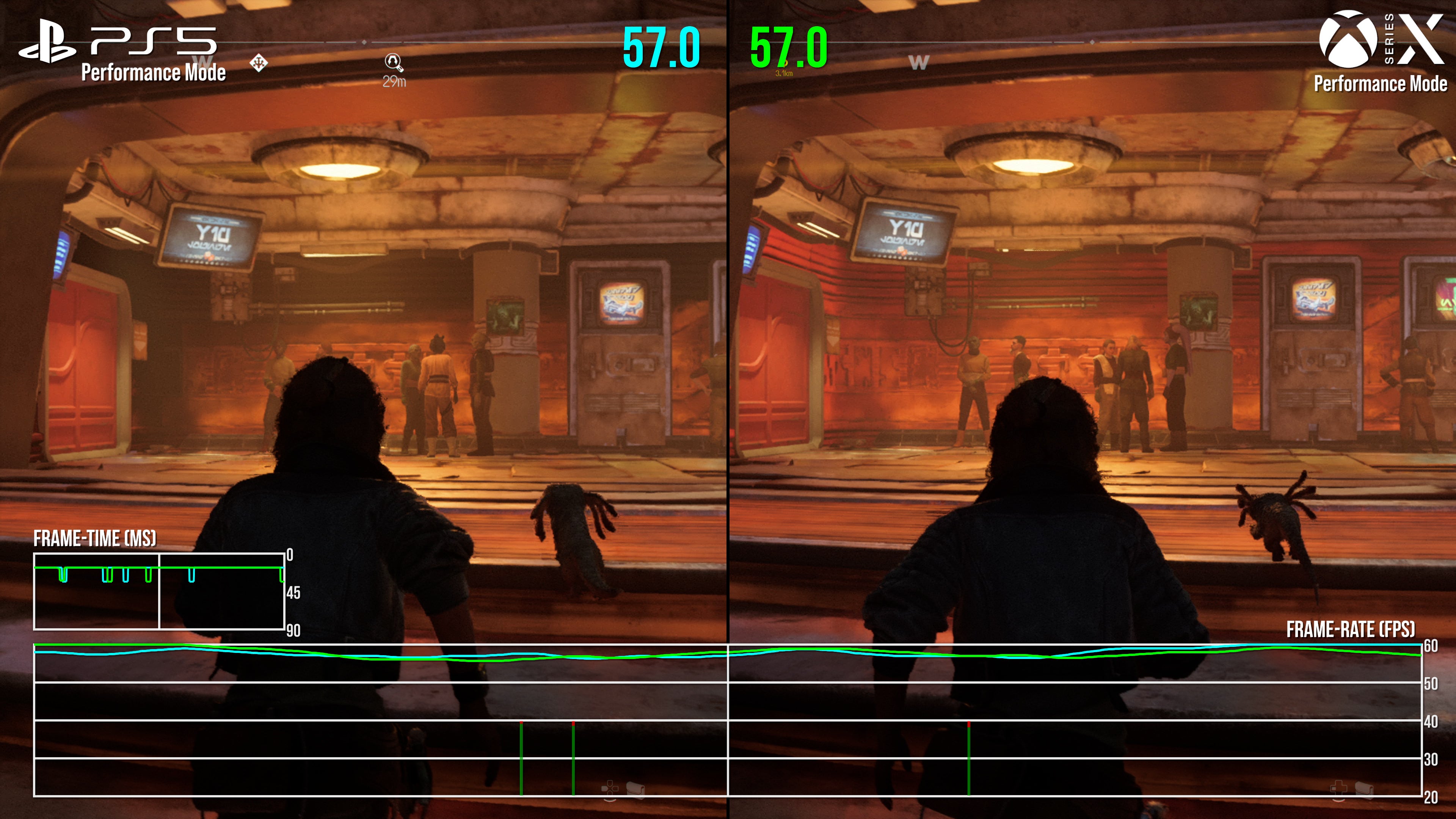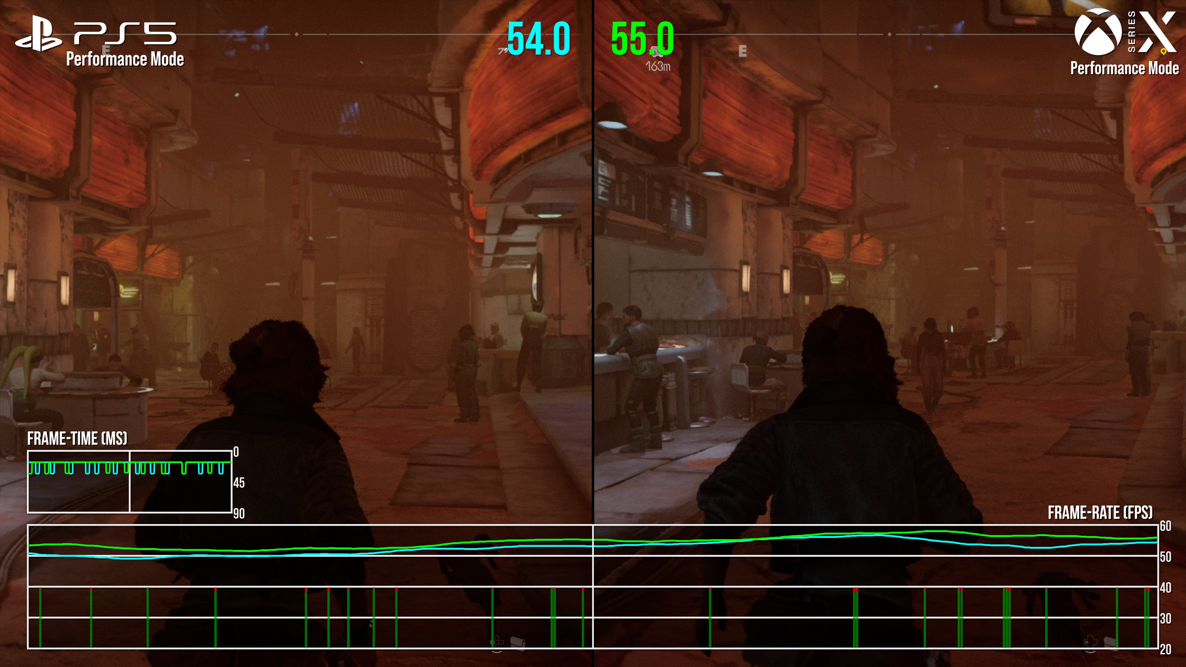 Rounding out PS5 and Series X testing is the 60fps performance mode, and despite the lower resolution and dropped settings, a locked 60fps isn't quite on the cards. Space battles and sneaking through small interiors is largely at 60fps, but navigating big cities or wider landscapes results in drops into the 50s on both machines.