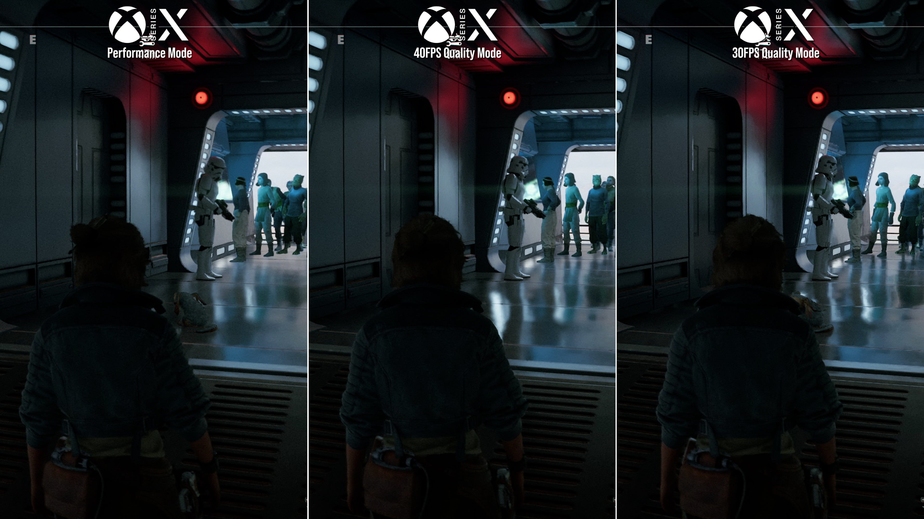 Beyond this there's a difference in the quality of reflected elements: stormtroopers at security checkpoints reflect at a lower quality level on performance mode, while reflections in the marshlands exhibit more break-up on the water surface. In motion, this is really the biggest pitfall to using the 60fps mode: with an internal resolution of 720p to 1080p, not only are there more aliasing artefacts while using Speeders outside, but reflected elements shimmer and distort much more visibly.