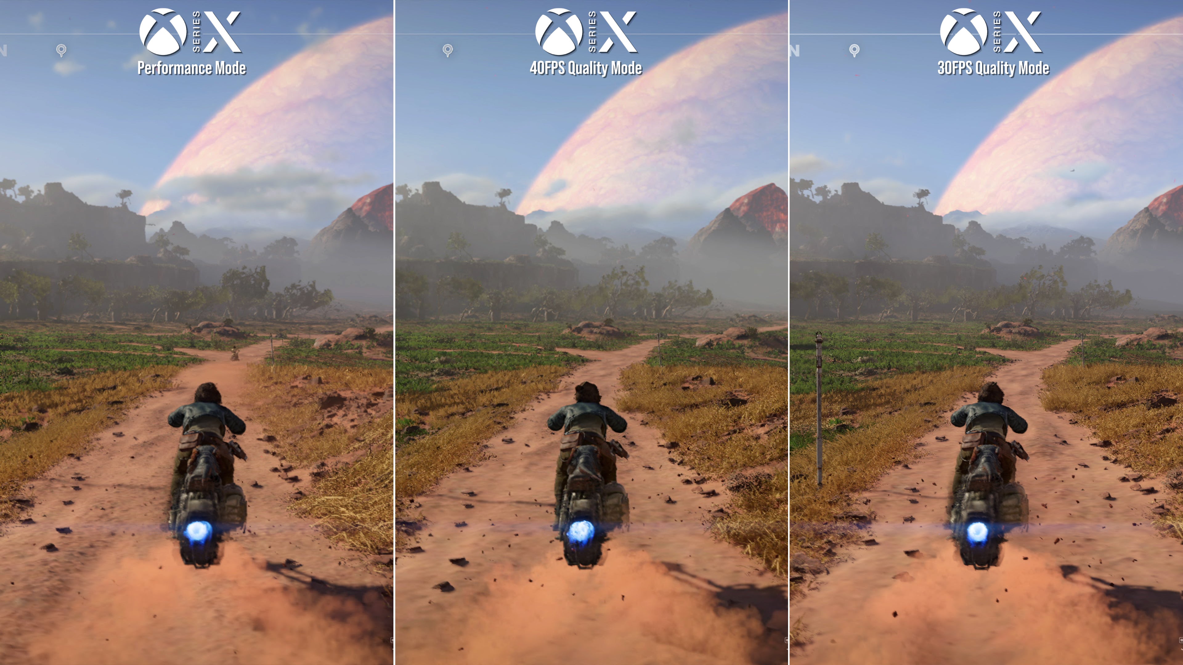 Comparisons between each mode reveal a few other tweaks on PS5 and Series X. Shadows, volumetrics, textures and most other settings stay intact, but grass density drops in using the 60fps performance mode. It's tough to notice outside of comparisons, but fields do have a sparser distribution of grass, with the 40fps mode using a setting between the 30 and 60fps modes. Likewise, zoom in close, and performance mode drops the overall draw distance to foliage as well.