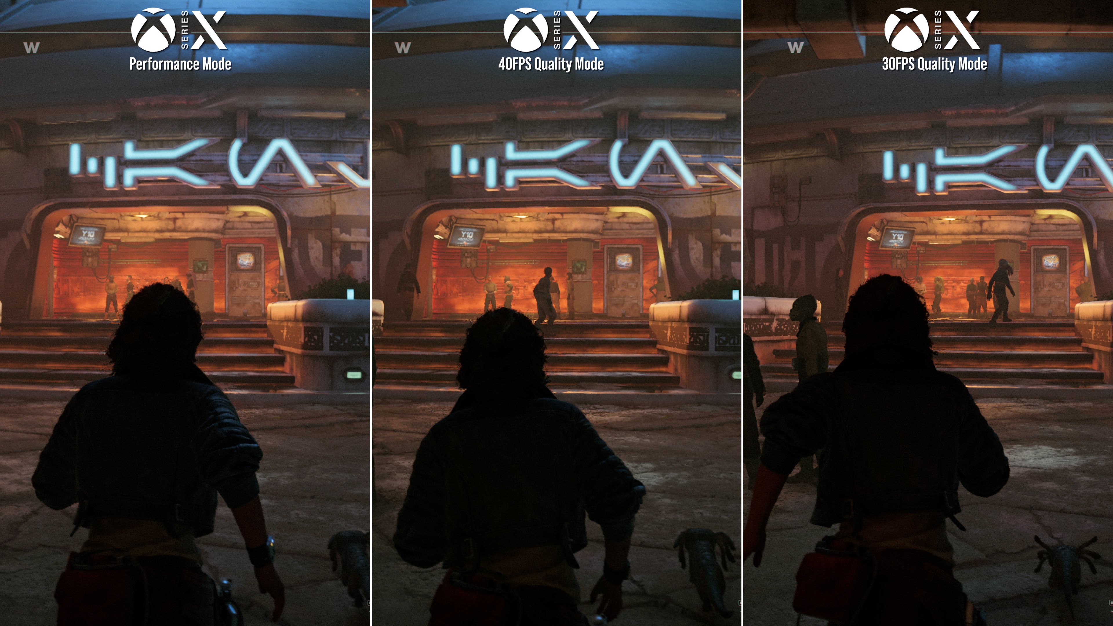 Much like Avatar, Star Wars Outlaws also deploys ray tracing on all console versions, from the powerful PS5 and Series X to the 4TF Series S. Indeed, ray tracing is locked in place as a core part of Outlaws' visual design on every console and in every mode, with no opt out. Looking at the bustling Mirogana City, this arrives in the form of ray-traced global illumination (RTGI), allowing for a simulated light bounce from its neon signs across the player and nearby walls. The result is a vivid splash of dark primary colours, lighting - and shading - the alcoves of the cantina with hues of green and red. Ray traced shadows make the grade, too, though it appears the console implementation to limited to distant rocky outcrops in open areas - with PC offering a more comprehensive solution for all objects. Finally, Outlaws also offers ray-traced reflections on console, mirroring all its mountainous backdrops, with a layer of screen-space reflections (SSR) to add on more detail to capture NPCs and creature movement. This hybrid method worked well in Avatar too, striking a good balance between realism and performance.